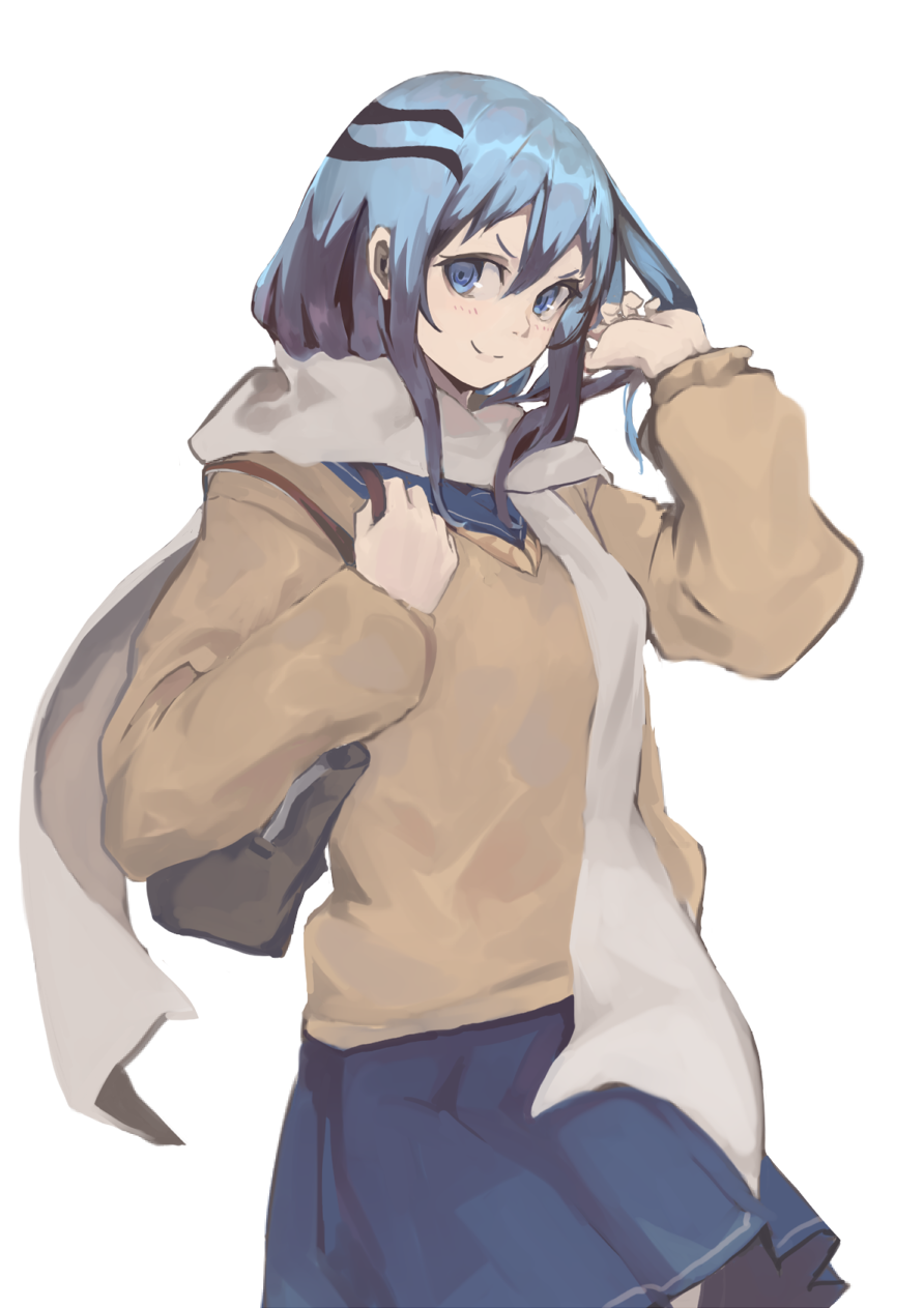 1girl acccty bag blue_eyes blue_hair blue_skirt brown_bag cardigan closed_mouth commentary_request highres long_hair long_sleeves looking_at_viewer nurarihyon_no_mago oikawa_tsurara scarf school_bag school_uniform simple_background skirt smile solo white_background white_scarf yellow_cardigan yuki_onna yuki_onna_(nurarihyon_no_mago)