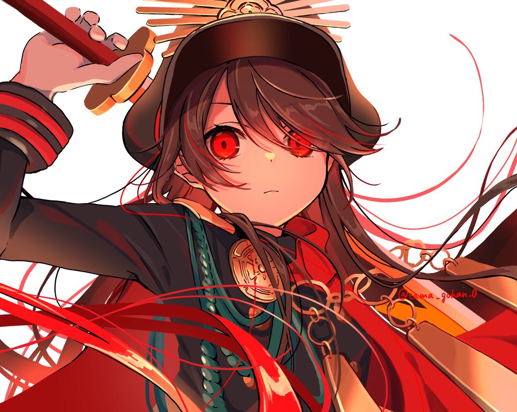 1girl black_hair cape closed_mouth commentary_request crest expressionless family_crest fate/grand_order fate/type_redline fate_(series) frown gold_trim hat holding holding_sword holding_weapon koha-ace long_hair long_sleeves looking_at_viewer military military_hat military_uniform multicolored_hair oda_nobunaga_(fate) oda_nobunaga_(koha-ace) oda_uri official_alternate_hair_color peaked_cap red_cape red_eyes red_hair simple_background solo sword twitter_username two-tone_hair upper_body very_long_hair weapon white_background yui_(tamagohan)