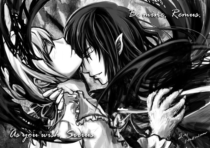 2boys blush character_name claws closed_eyes english_text frills fur harry_potter_(series) looking_at_another male_focus monochrome multiple_boys parted_lips pixiv_id_3453712 pointy_ears profile remus_lupin sirius_black vampire werewolf wizarding_world yaoi