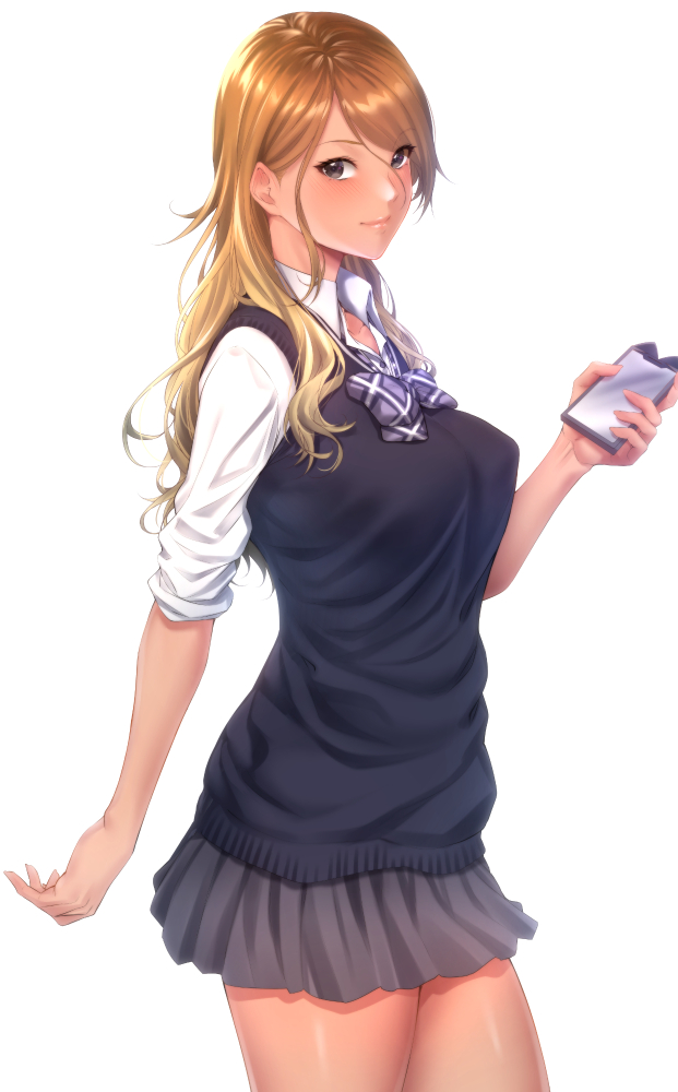 1girl black_eyes blonde_hair blush brown_hair cellphone gradient_hair idolmaster idolmaster_shiny_colors izumi_mei long_hair multicolored_hair neck_ribbon phone pleated_skirt ribbon school_uniform skirt smartphone smile solo vest zucchini
