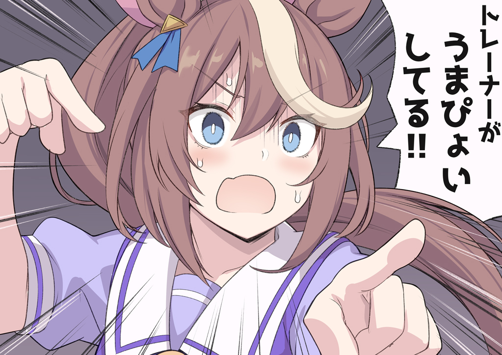 1girl animal_ears blue_bow blue_eyes blue_shirt blush bow bowtie breasts brown_hair hair_ribbon high_ponytail horse_ears horse_girl large_breasts long_hair looking_at_viewer multicolored_hair open_mouth pointing pointing_at_viewer ponytail puffy_short_sleeves puffy_sleeves ribbon sailor_collar school_uniform shirt shiseki_hirame short_sleeves sidelocks solo speech_bubble streaked_hair tokai_teio_(umamusume) tracen_school_uniform translated two-tone_hair umamusume umapyoi_(phrase) white_hair white_sailor_collar