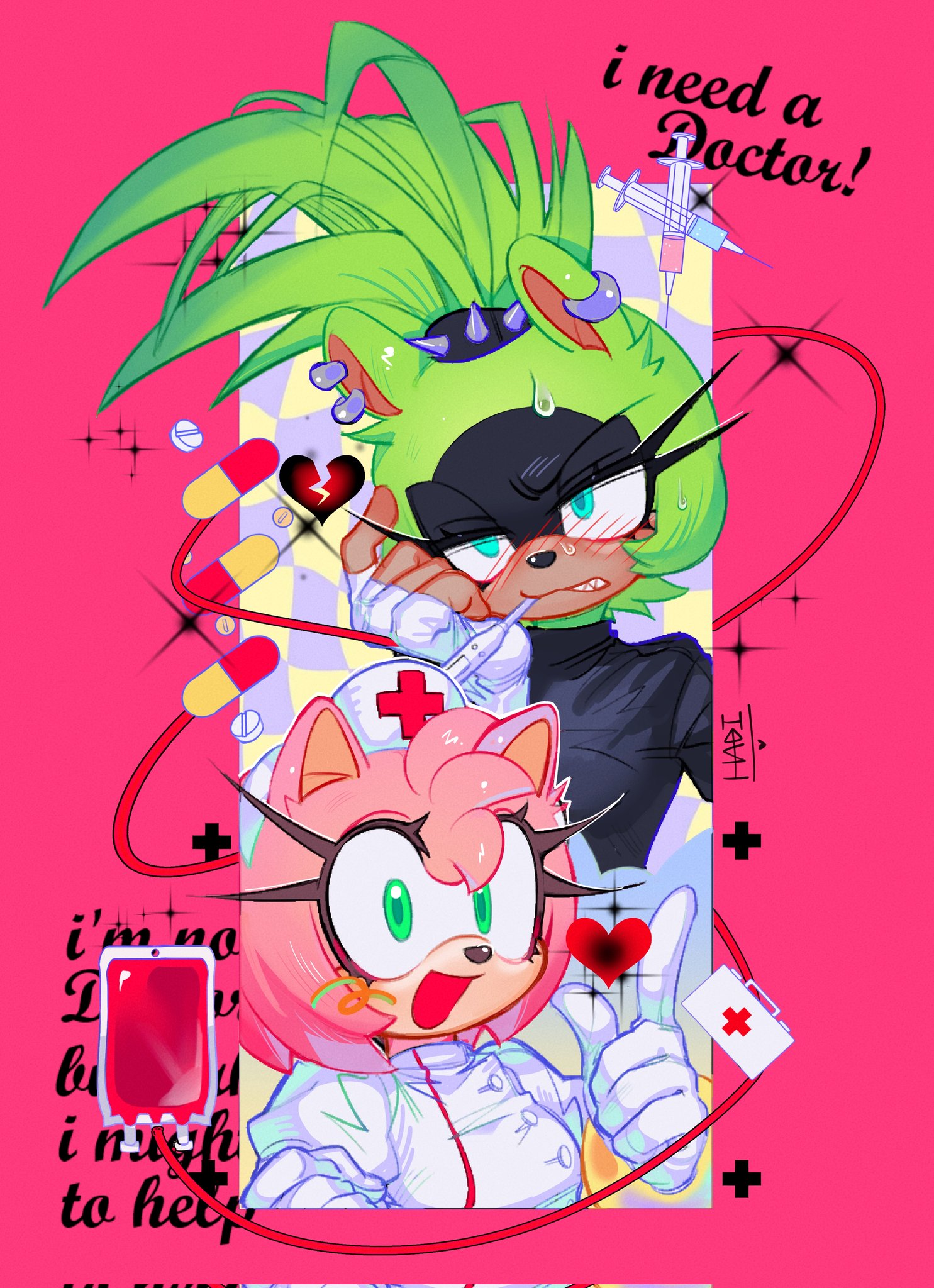 2girls 3mia_hadi3 amy_rose annoyed aqua_eyes black_shirt blood blood_bag blush breasts cable clenched_hand commentary ear_piercing english_commentary finger_gun fingerless_gloves furry furry_female gloves green_hair hat head_tilt heart highres jacket looking_at_viewer medium_breasts multiple_girls nurse nurse_cap open_mouth piercing pill ponytail shirt smile sonic_(series) sonic_the_hedgehog_(idw) sparkle spikes surge_the_tenrec sweatdrop syringe white_gloves white_jacket