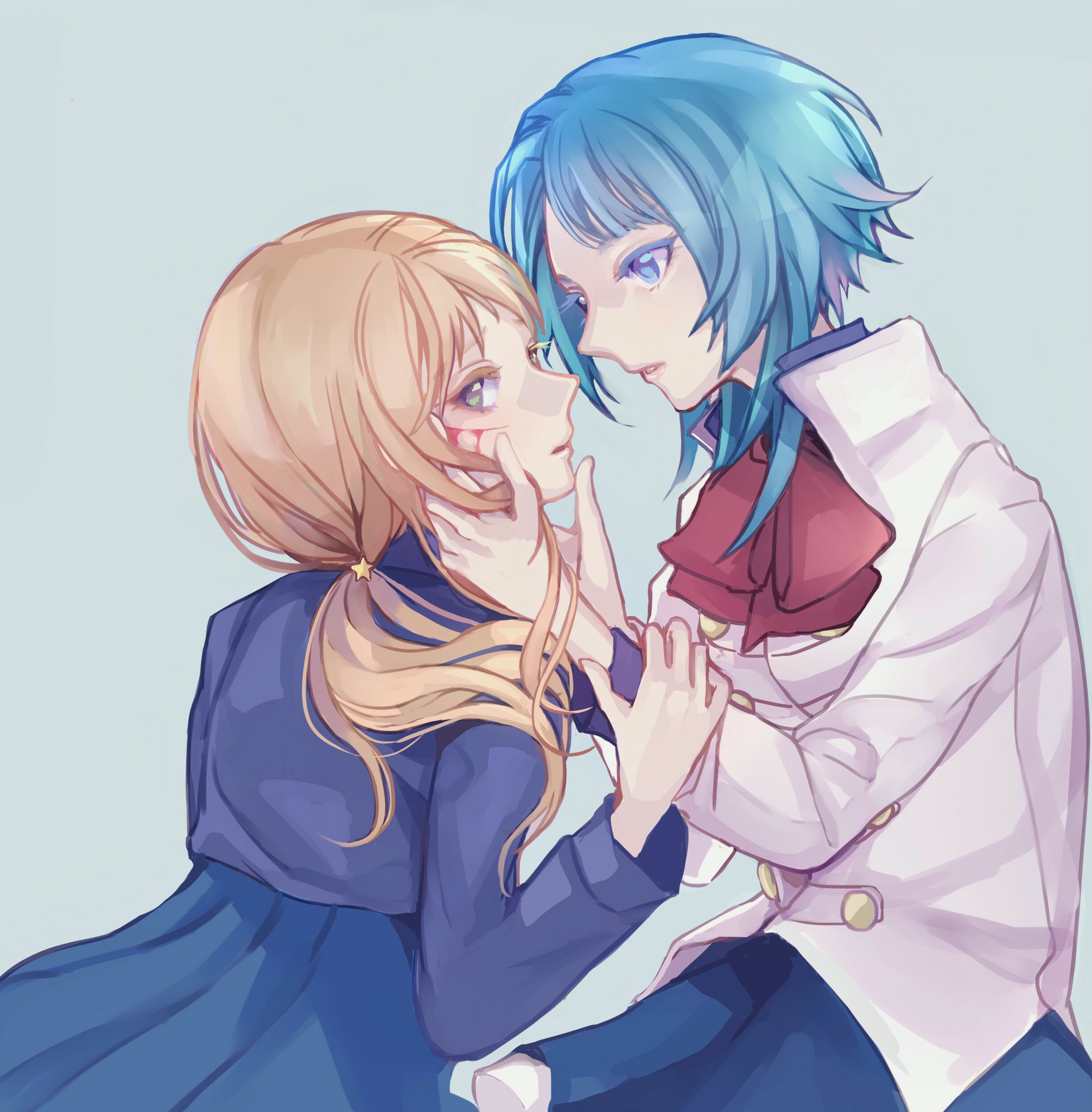 2girls aizawa_kazuha aqua_background assault_lily asymmetrical_hair azamino_(lbkamaboko) blood blood_on_face blue_eyes blue_hair blue_skirt bow bowtie buttons closed_mouth collared_shirt commentary cuts face-to-face frilled_skirt frills from_side grey_eyes hair_ornament hand_in_another's_hair hand_on_another's_arm hand_on_another's_cheek hand_on_another's_chin hand_on_another's_face hand_up hands_up herensuge_girls_academy_school_uniform high-waist_skirt high_collar highres iijima_renka injury jacket light_brown_hair long_hair long_sleeves looking_at_another looking_away looking_to_the_side low_ponytail medium_hair miniskirt multiple_girls no_pupils parted_lips ponytail profile purple_shirt red_bow red_bowtie school_uniform shirt side_ponytail sideways_glance simple_background skirt standing star_(symbol) star_hair_ornament swept_bangs white_jacket yuri