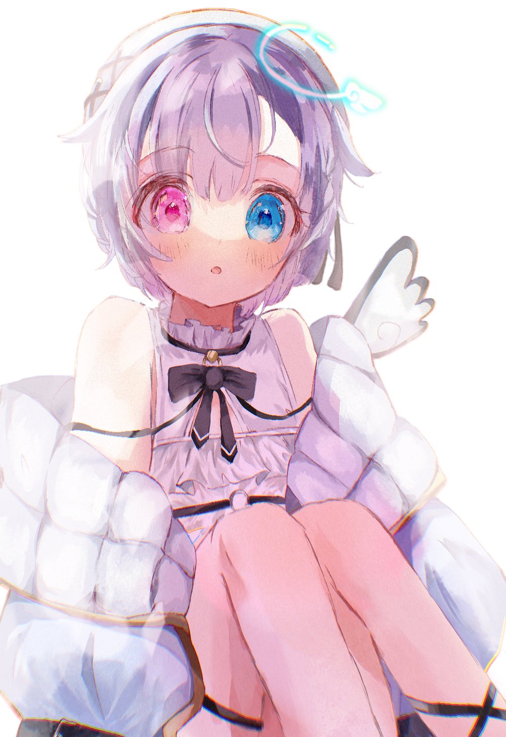 1girl amemiya_nazuna amemiya_nazuna_(1st_costume) angel angel_wings blue_eyes blush breasts broken_halo cleavage_cutout clothing_cutout commentary detached_wings frilled_shirt frills halo hat heterochromia highres jacket looking_at_viewer off_shoulder open_mouth pink_eyes shirt short_hair small_breasts thigh_strap tumu_721 virtual_youtuber vshojo white_hair white_headwear white_jacket white_shirt wings