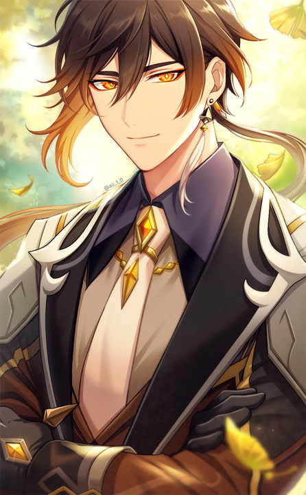 1boy ao_1_0 black_gloves blurry blurry_background brown_hair brown_vest closed_mouth collared_shirt commentary_request crossed_arms diamond-shaped_pupils diamond_(shape) earrings eyeliner falling_leaves formal_clothes gem genshin_impact ginkgo_leaf gloves gradient_hair hair_between_eyes jewelry leaf long_sleeves low_ponytail makeup male_focus multicolored_hair necktie orange_eyes orange_hair ponytail red_eyeliner shirt single_earring smile solo symbol-shaped_pupils tassel tassel_earrings thumb_ring twitter_username vest white_necktie wing_collar zhongli_(genshin_impact)