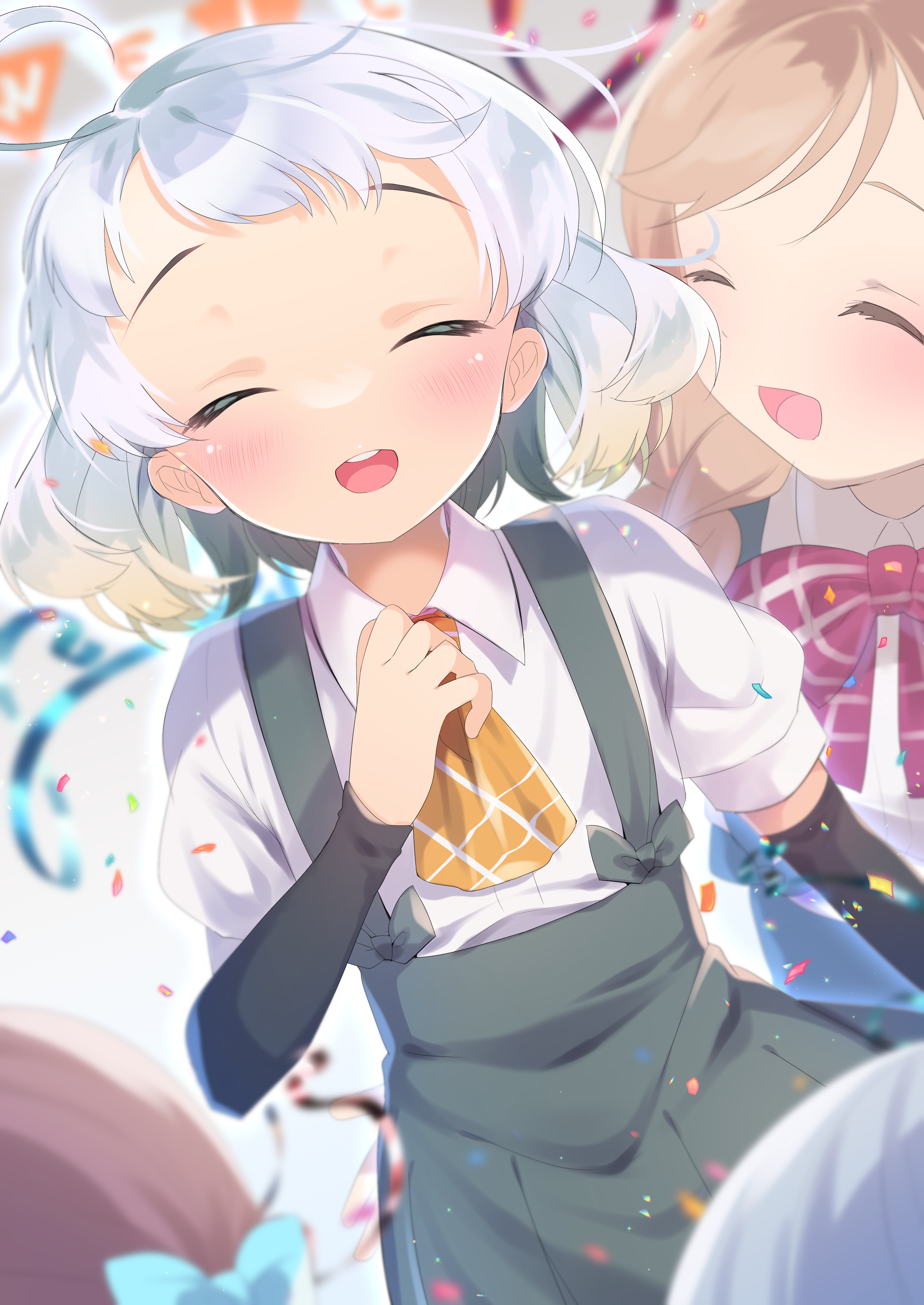 4girls absurdres arm_warmers asagumo_(kancolle) ascot bow bowtie closed_eyes commentary_request confetti grey_skirt highres kantai_collection light_brown_hair minegumo_(kancolle) multiple_girls natsugumo_(kancolle) orange_ascot plaid_ascot plaid_bow plaid_bowtie plaid_clothes pleated_skirt red_bow red_bowtie shirt short_hair skirt smile solo_focus suspender_skirt suspenders tsunoda_magu white_hair white_shirt yamagumo_(kancolle)