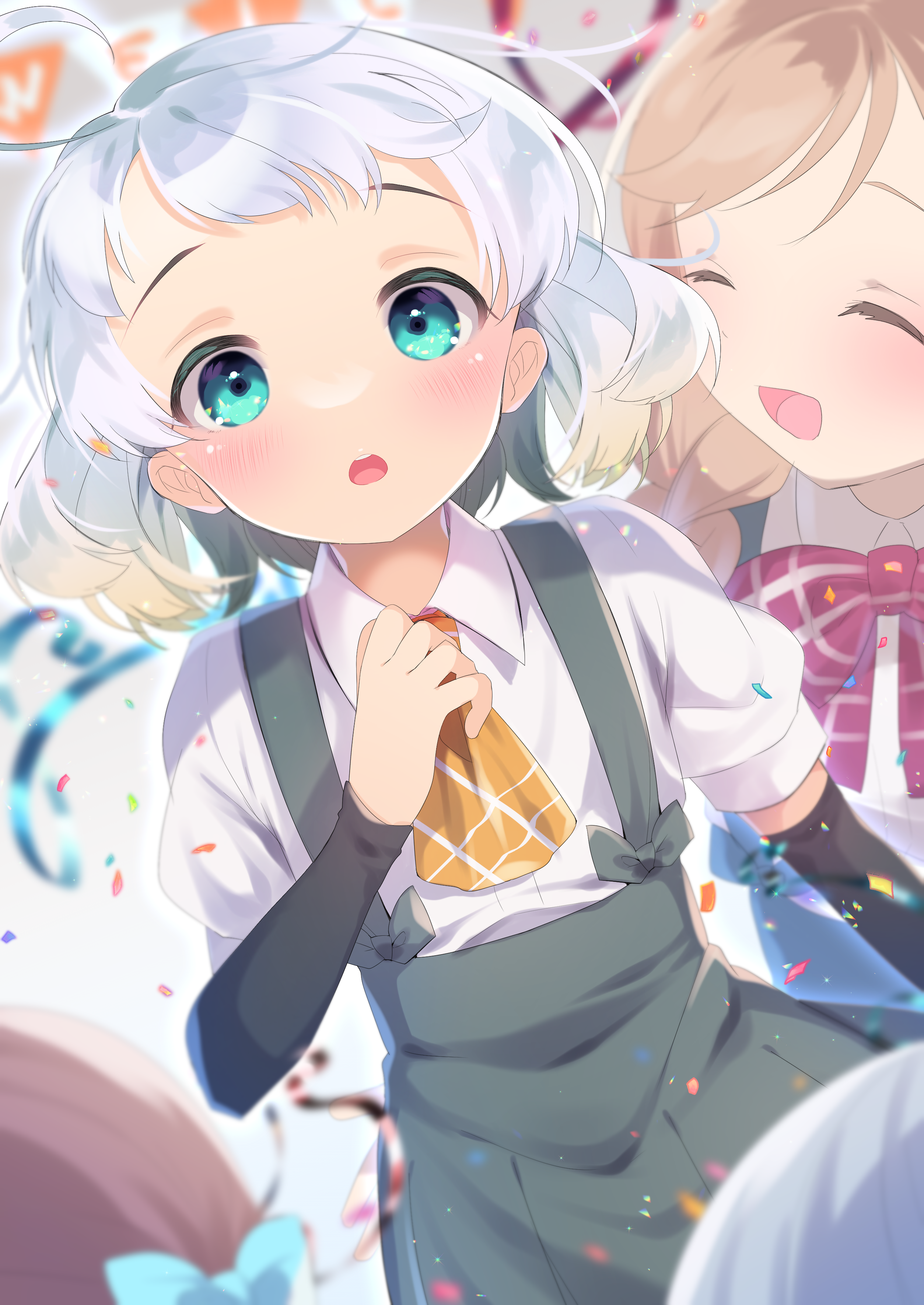 4girls absurdres arm_warmers asagumo_(kancolle) ascot blue_eyes bow bowtie closed_eyes commentary_request confetti grey_skirt highres kantai_collection light_brown_hair minegumo_(kancolle) multiple_girls natsugumo_(kancolle) orange_ascot plaid_ascot plaid_bow plaid_bowtie plaid_clothes pleated_skirt red_bow red_bowtie shirt short_hair skirt smile solo_focus suspender_skirt suspenders tsunoda_magu white_hair white_shirt yamagumo_(kancolle)