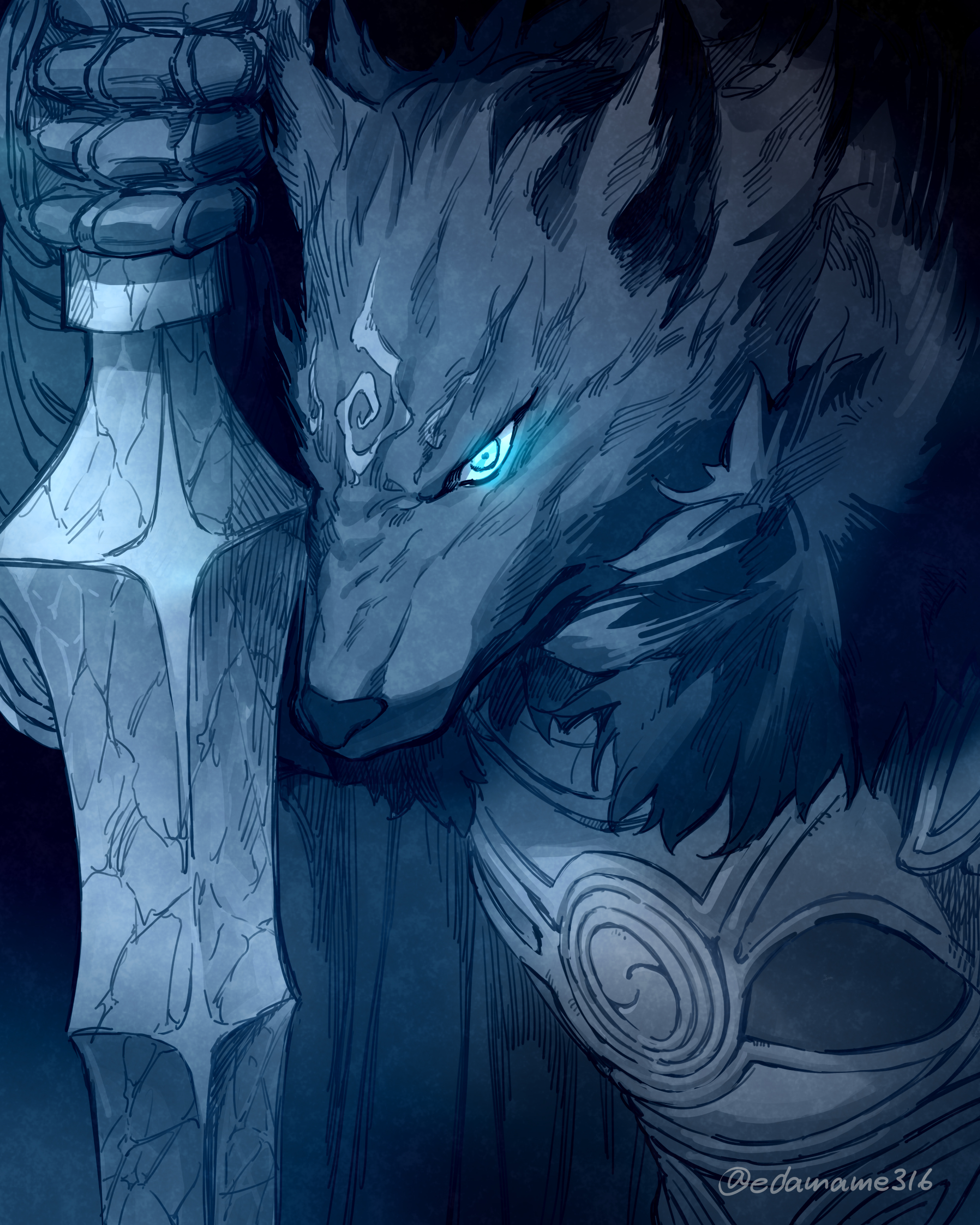 1boy absurdres armor closed_mouth commentary_request edamameoishii expressionless facial_mark facial_tattoo fate/grand_order fate_(series) forehead_mark forehead_tattoo fur_collar fur_trim furry furry_male glowing glowing_eyes highres holding holding_sword holding_weapon kukochihiko_(fate) looking_at_viewer male_focus monochrome solo sword tattoo twitter_username upper_body weapon wolf_boy