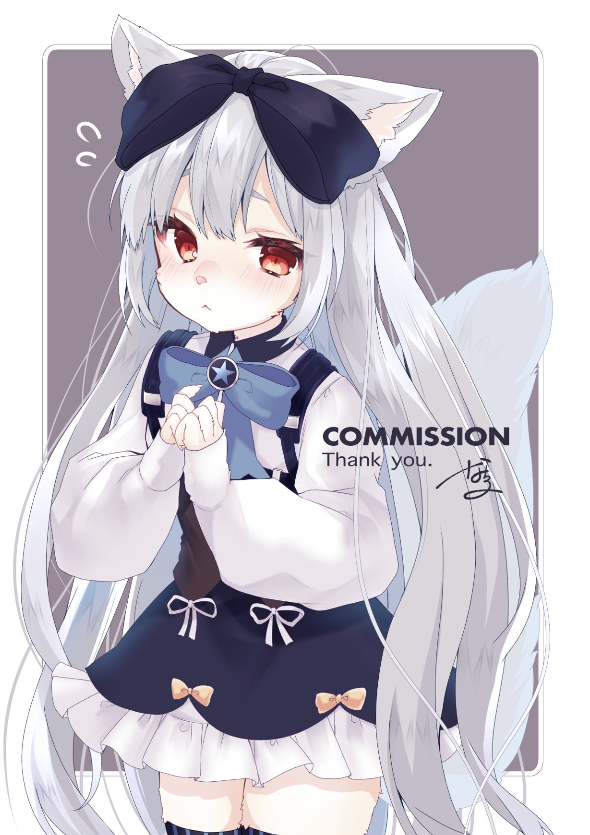 1girl :< animal_ear_fluff animal_ears animal_nose artist_name blue_bow blue_bowtie blue_dress blue_theme blush body_fur border bow bowtie brooch cat_ears cat_girl cat_tail closed_mouth collared_shirt commission cowboy_shot dress english_text female_focus flat_chest flying_sweatdrops frilled_dress frills furry furry_female girls'_frontline grey_hair hair_bow hands_up highres jewelry long_hair long_sleeves looking_at_viewer nachiru nervous original outside_border own_hands_together pinafore_dress puffy_long_sleeves puffy_sleeves purple_background red_eyes shirt short_dress sidelocks signature simple_background skeb_commission sleeveless sleeveless_dress sleeves_past_wrists solo standing star_(symbol) striped_clothes striped_thighhighs tail thank_you thighhighs thighs tokarev_(snowfall_in_the_alley)_(girls'_frontline) two-tone_fur very_long_hair white_border white_fur white_shirt yellow_fur zettai_ryouiki