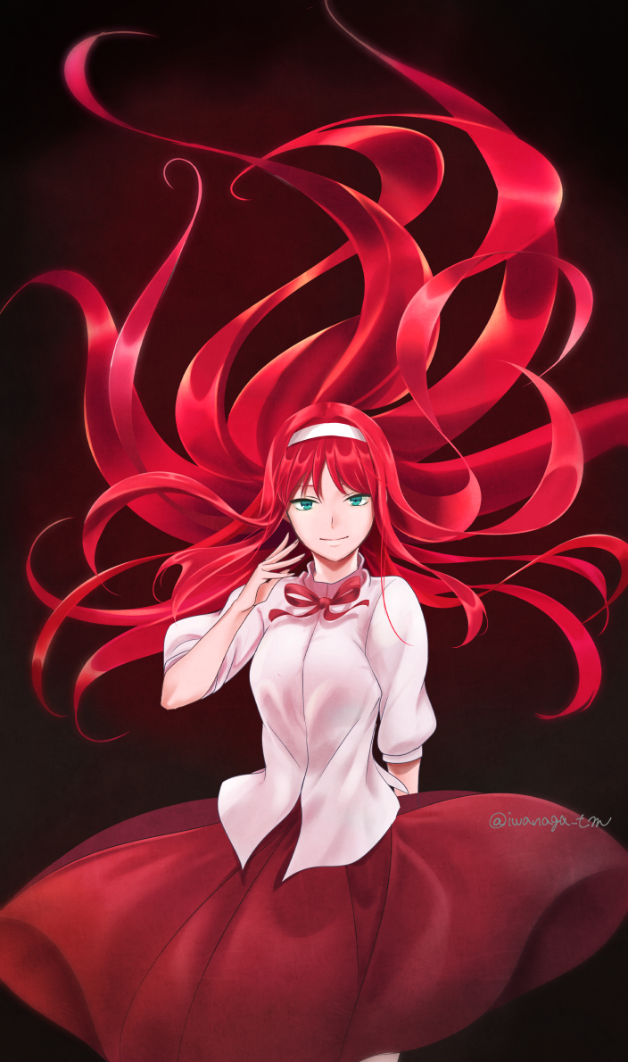 1girl black_background closed_mouth green_eyes hairband iwanaga_tm long_hair looking_at_viewer melty_blood red_hair red_skirt short_sleeves simple_background skirt smile solo tohno_akiha toono_akiha tsukihime twitter_username vermillion_akiha white_hairband