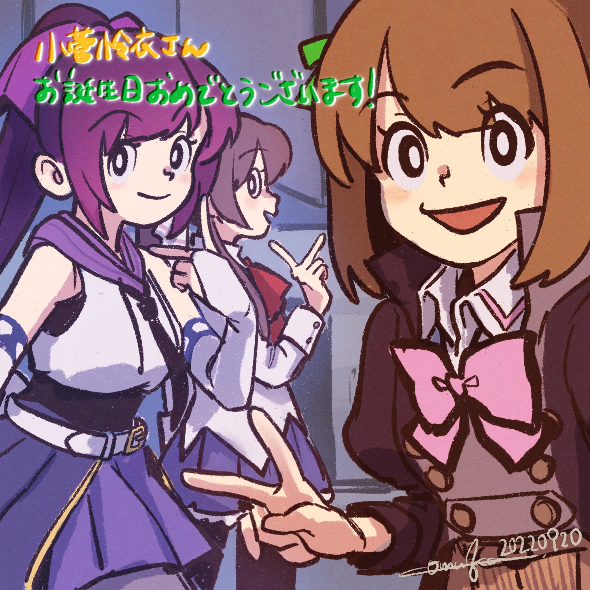 3girls :d artist_name assault_lily belt belt_buckle black_eyes black_necktie black_pantyhose black_shirt blue_skirt bow bowtie breasts bridal_gauntlets bright_pupils brown_hair brown_jacket buckle buttons closed_mouth collared_shirt commentary crop_top dated elbow_gloves fukushima_ritsu gloves green_ribbon grey_background hair_between_eyes hair_bow hair_ribbon hand_up happy_birthday herensuge_girls_academy_school_uniform high_ponytail highres jacket juliet_sleeves komuzuka kosuge_rei long_hair long_sleeves looking_at_viewer looking_to_the_side ludvico_private_girls'_academy_school_uniform medium_breasts miniskirt multiple_girls necktie open_mouth pantyhose pink_bow pink_bowtie ponytail profile puffy_sleeves purple_bow purple_hair purple_sailor_collar red_bow red_bowtie retro_artstyle ribbon saeki_julia_karen sailor_collar school_uniform serafuku serizawa_chikaru shirt short_hair sideways_glance signature skirt sleeveless sleeveless_shirt smile standing translated undershirt v voice_actor_connection white_belt white_bow white_gloves white_jacket white_pupils white_shirt