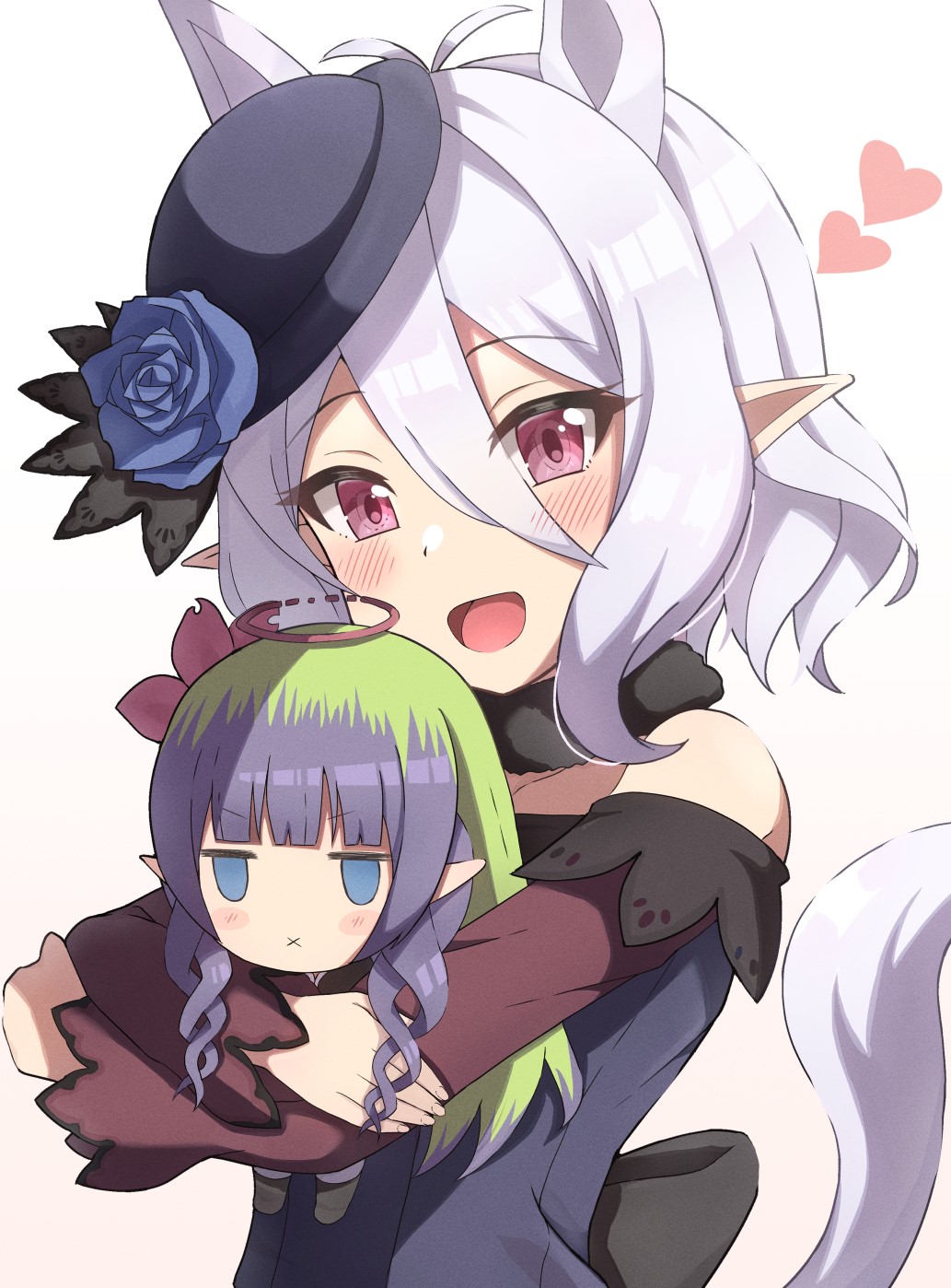 1girl ameth_(princess_connect!) animal_ears bare_shoulders blue_flower blue_rose blush character_doll cosplay doll dress extra_ears flower fur_choker hair_between_eyes hat hat_flower heart highres horse_ears horse_girl horse_tail hugging_doll hugging_object kokkoro_(princess_connect!) long_sleeves open_mouth pink_eyes pointy_ears princess_connect! rice_shower_(umamusume) rice_shower_(umamusume)_(cosplay) rose seiji_(artman) short_hair sidelocks smile solo tail umamusume upper_body white_background white_hair x_mouth