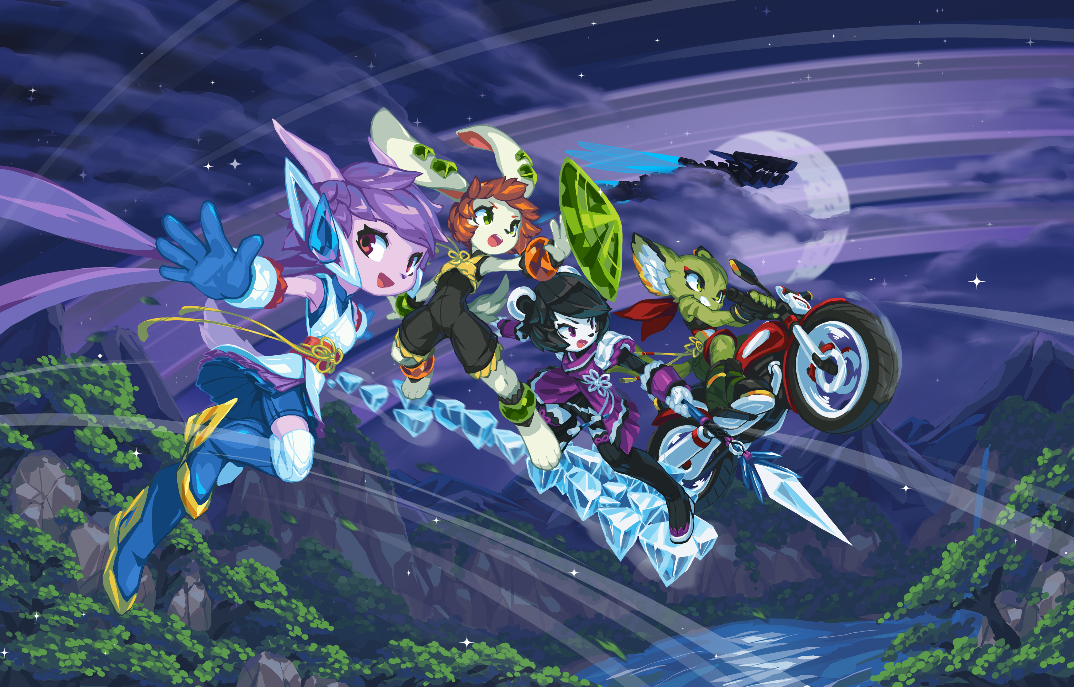 4girls abstract_background absurdres action animal_ears armor barefoot bodysuit boots bracelet carol_tea cat_ears cat_tail crop_top dog_ears dragon_girl dragon_horns eyelashes freedom_planet frown furry galaxytrail gloves green_eyes headgear highres horns ice japanese_clothes jewelry kimono lake long_ears long_hair looking_at_viewer milla_basset moon motor_vehicle motorcycle mountain multiple_girls neera_li official_art open_mouth orange_hair panda_ears pink_eyes purple_eyes purple_hair sash_lilac scarf shield short_hair shorts shoulder_armor sky smile staff tail thigh_boots thighhighs twintails tyson_tan unitard very_long_hair water