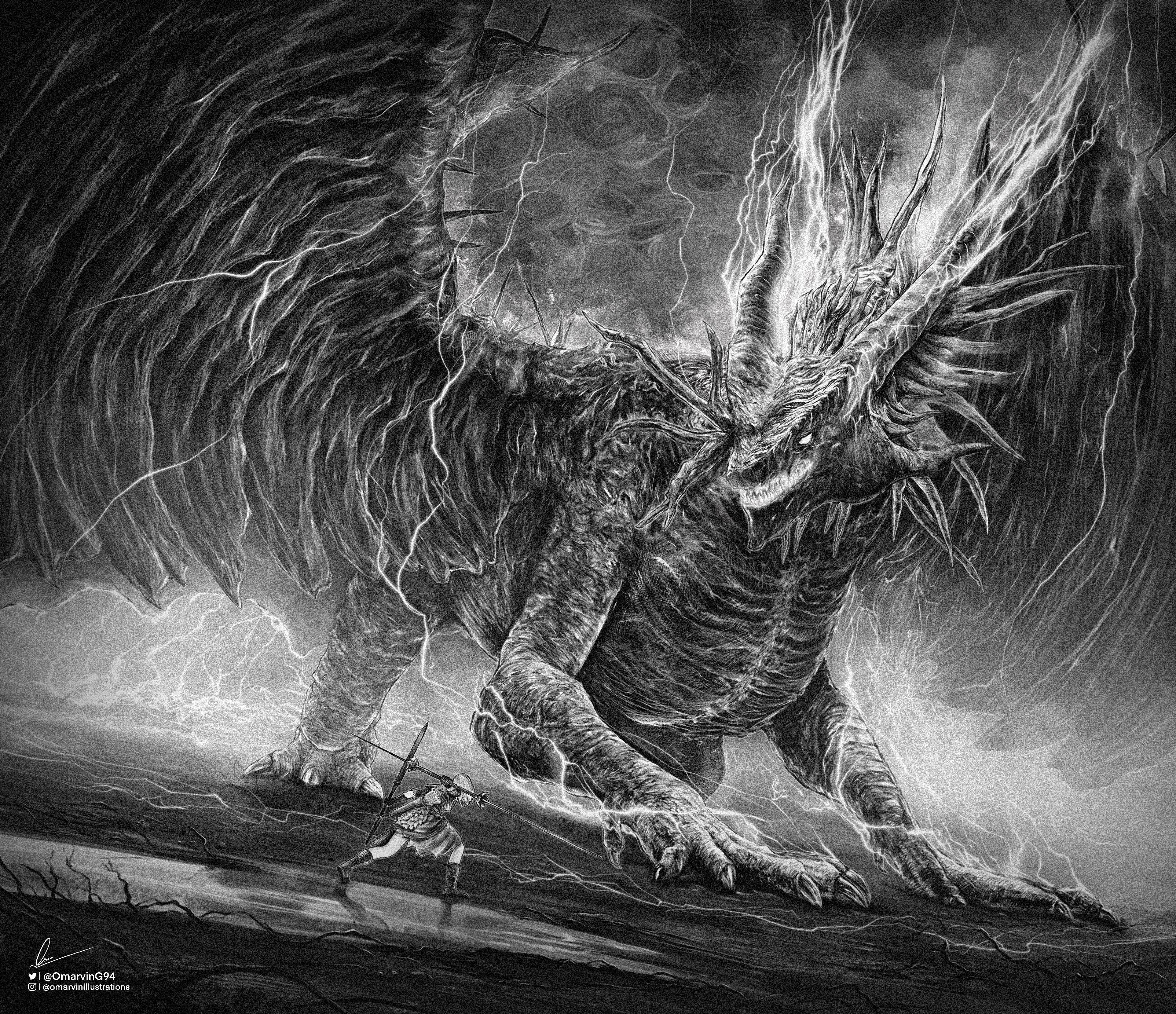 1girl absurdres arrow_(projectile) boots double_blade dragon dual_wielding elden_ring greyscale highres holding lichdragon_fortissax lightning marvin_(omarvin) monochrome polearm quiver rakuyo_(bloodborne) sharp_teeth signature solo sword tarnished_(elden_ring) teeth twitter_username weapon western_dragon wings