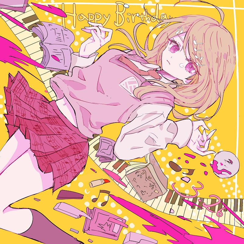 1girl ahoge akamatsu_kaede blonde_hair book breasts cardigan danganronpa_(series) danganronpa_v3:_killing_harmony dated feet_out_of_frame fortissimo hair_ornament happy_birthday long_hair long_sleeves looking_at_viewer medium_breasts midriff musical_note musical_note_hair_ornament musical_note_print navel necktie nocoyaki piano_keys pink_cardigan purple_eyes red_necktie red_skirt sheet_music shirt skirt solo swept_bangs tears w_arms white_shirt yellow_background