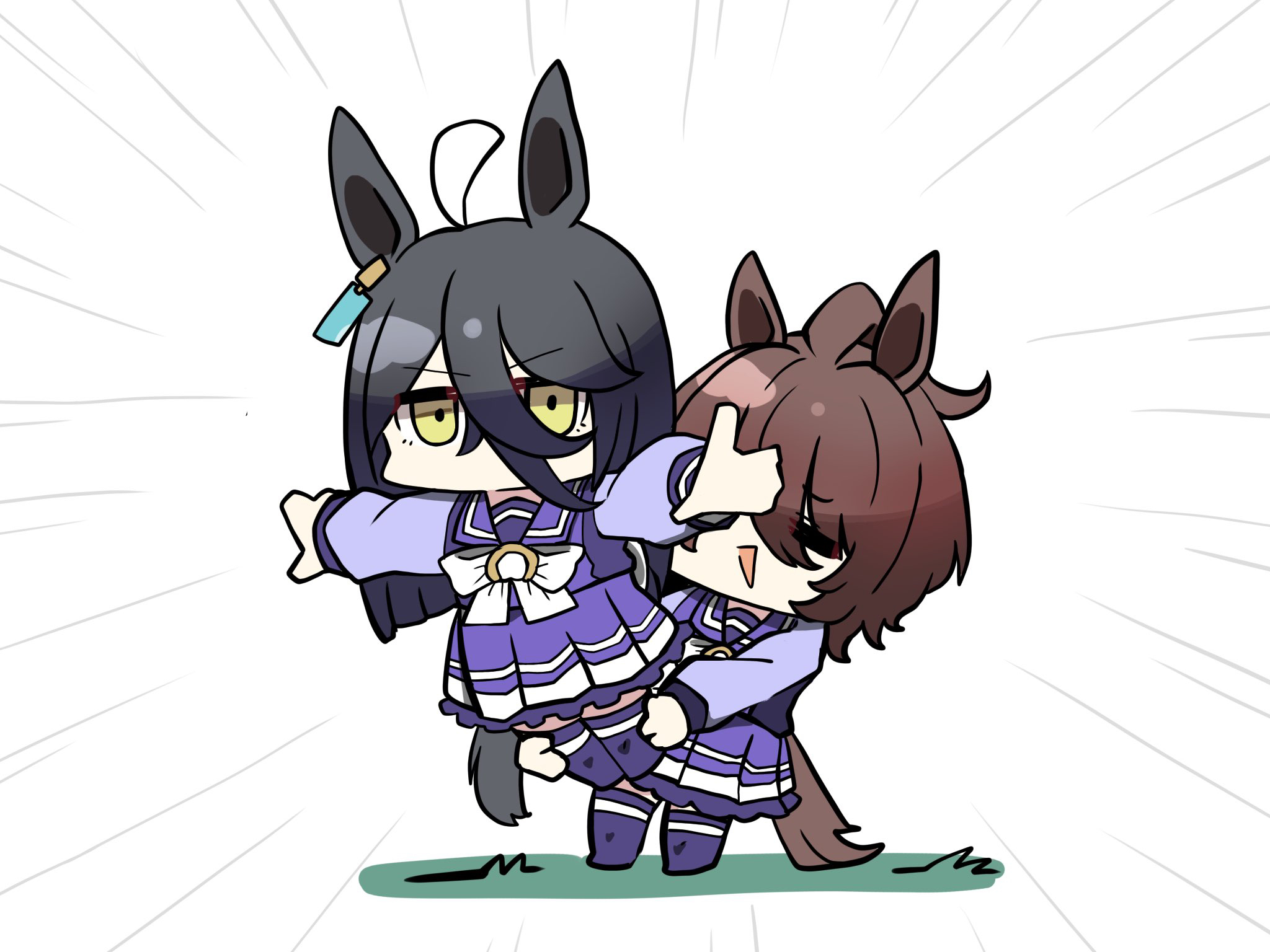 2girls agnes_tachyon_(umamusume) ahoge animal_ears bow bowtie chibi commentary_request earrings emphasis_lines frilled_skirt frills full_body hair_between_eyes highres horse_ears horse_girl horse_tail horseshoe_ornament jewelry jitome kawamochi_(kawauti919) lifting_person long_bangs long_hair long_sleeves manhattan_cafe_(umamusume) medium_hair messy_hair multiple_girls no_mouth outstretched_arms pleated_skirt purple_eyes purple_shirt purple_skirt purple_thighhighs sailor_collar sailor_shirt school_uniform shirt simple_background single_earring sketch skirt t-pose tail thighhighs tracen_school_uniform umamusume v-shaped_eyebrows white_background white_bow white_bowtie white_hair winter_uniform yellow_eyes