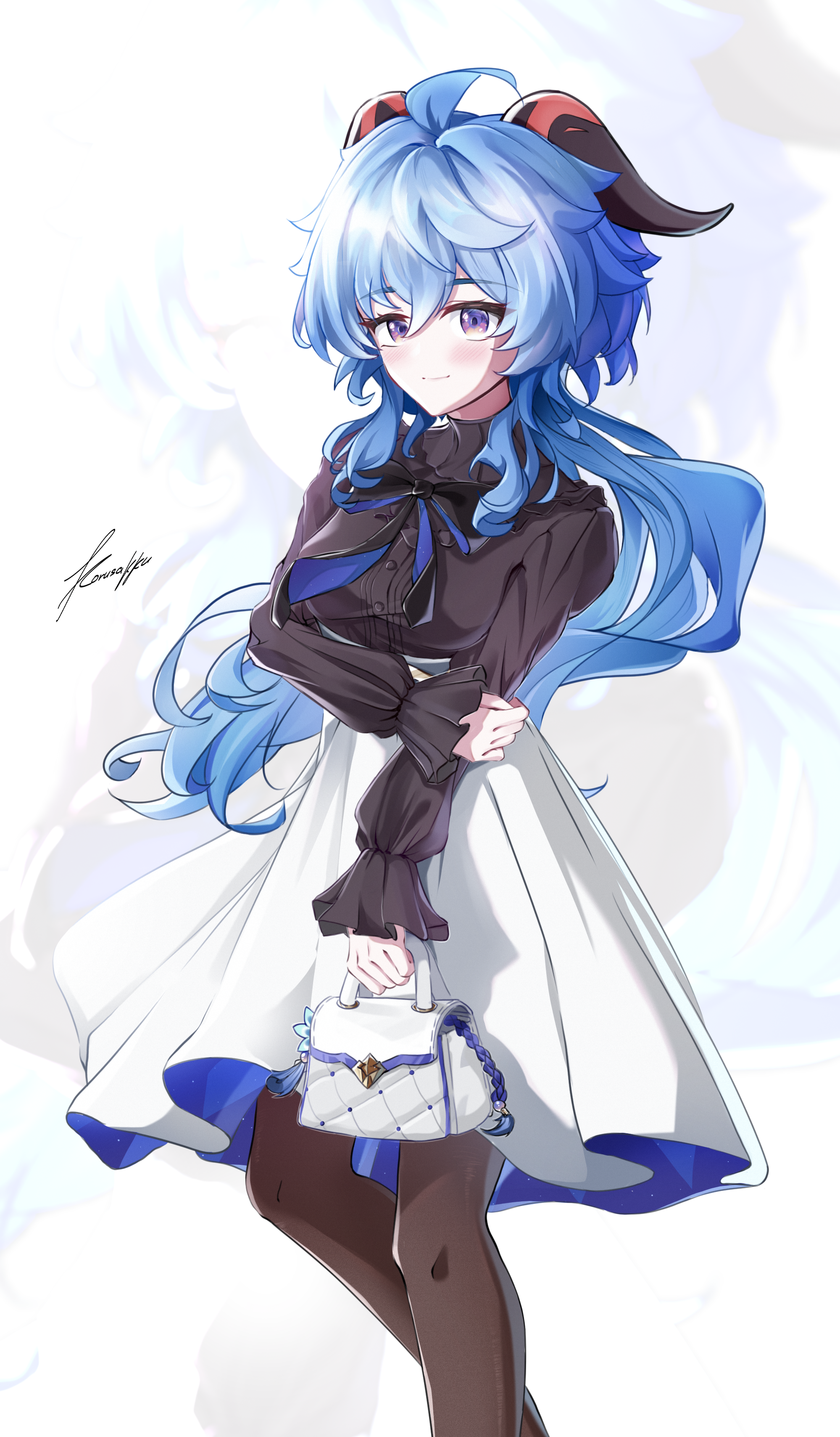 1girl absurdres ahoge bag black_bow black_bowtie black_shirt blue_hair blush bow bowtie breasts closed_mouth dress feet_out_of_frame frilled_sleeves frills ganyu_(china_merchants_bank)_(genshin_impact) ganyu_(genshin_impact) genshin_impact goat_horns gradient_eyes hair_between_eyes handbag high-waist_skirt highres holding holding_bag hand_on_own_arm horns korusakku legs long_hair long_sleeves looking_at_viewer low_ponytail medium_breasts multicolored_eyes official_alternate_costume pantyhose ponytail purple_eyes shirt shirt_tucked_in sidelocks signature simple_background skirt sleeves_past_wrists smile solo standing turtleneck white_background white_bag white_skirt zoom_layer