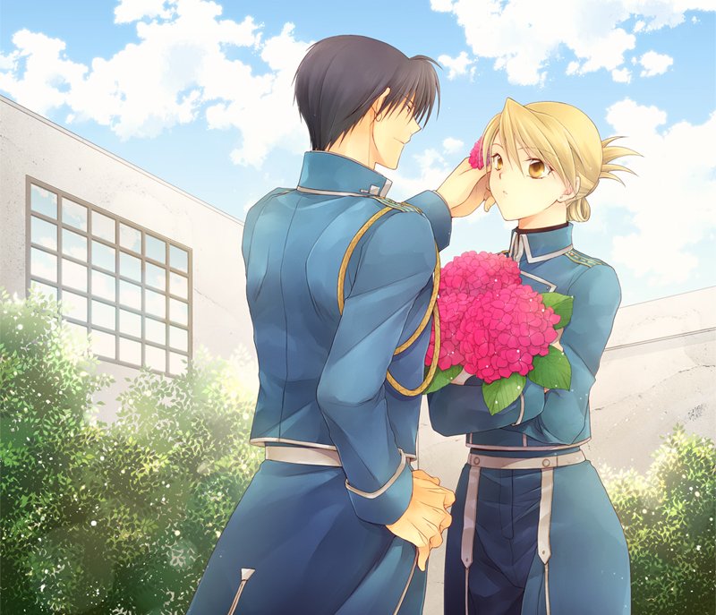 1boy 1girl black_hair blonde_hair blue_jacket blue_pants bouquet brown_eyes building cowboy_shot flower fullmetal_alchemist hair_flower hair_ornament hair_up hand_in_another's_hair hand_on_own_hip high_collar holding holding_bouquet jacket long_sleeves looking_at_another medium_hair military military_jacket military_uniform outdoors pants pink_flower riza_hawkeye roy_mustang short_hair takafuji_yuna tree