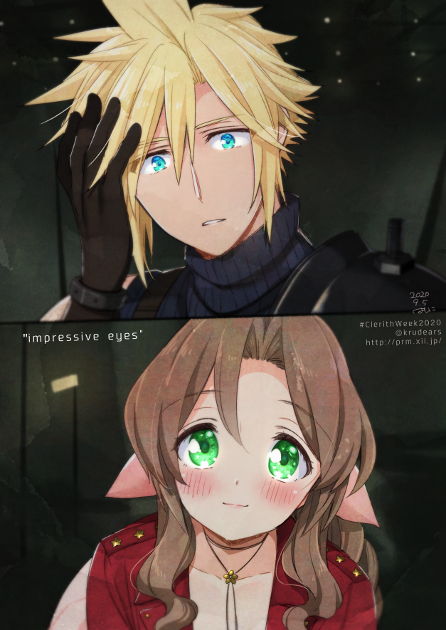 1boy 1girl aerith_gainsborough aqua_eyes armor artist_name blonde_hair blue_shirt blush braid braided_ponytail brown_gloves brown_hair choker cloud_strife dated dress final_fantasy final_fantasy_vii final_fantasy_vii_remake flower_choker gloves green_eyes hair_between_eyes hand_in_own_hair jacket krudears leaning_forward long_hair looking_at_viewer parted_bangs parted_lips pink_dress red_jacket shirt short_hair shoulder_armor sidelocks sleeveless sleeveless_turtleneck smile spiked_hair turtleneck twitter_username upper_body watermark wavy_hair web_address wide-eyed
