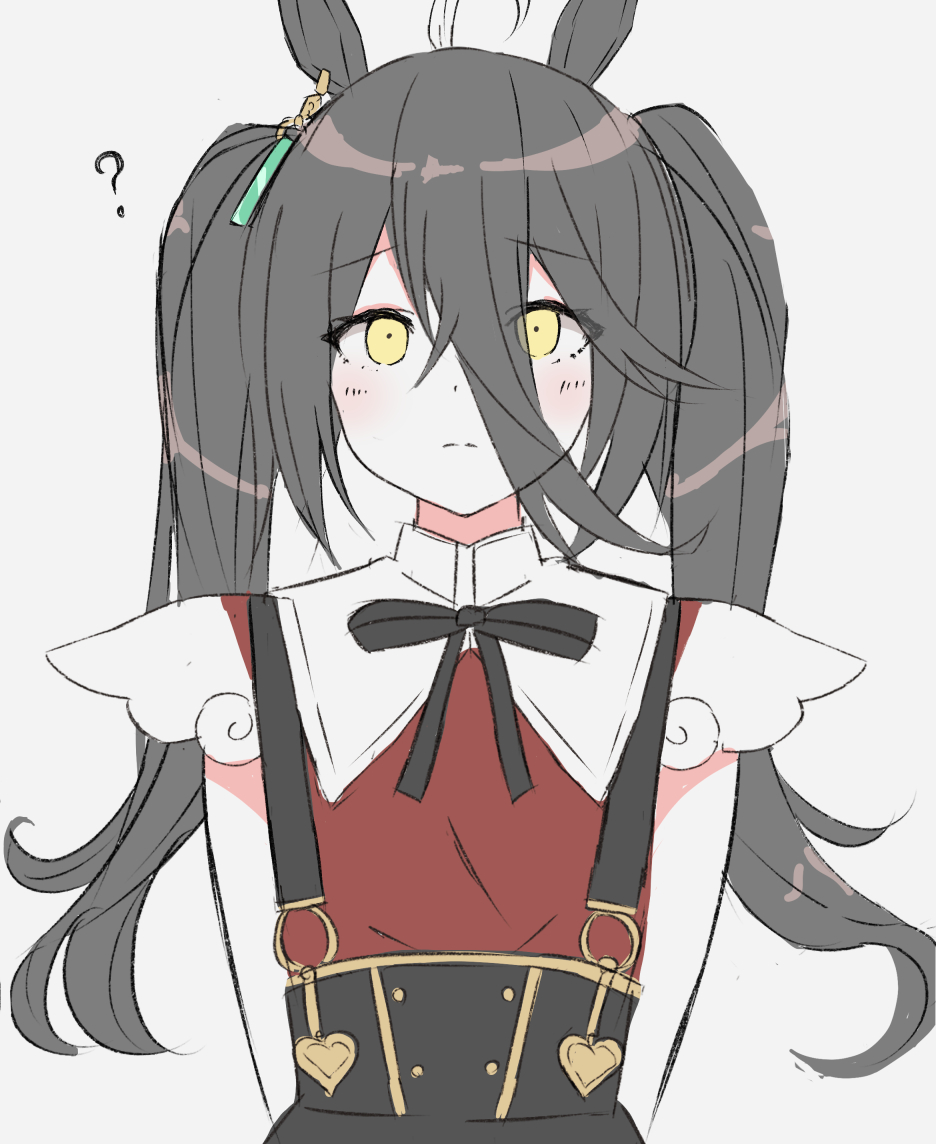 1girl ? ahoge animal_ears black_hair black_ribbon ear_tag hair_between_eyes hair_strand horse_ears long_hair manhattan_cafe_(umamusume) musicccc red_shirt ribbon shirt sidelocks solo twintails umamusume yellow_eyes