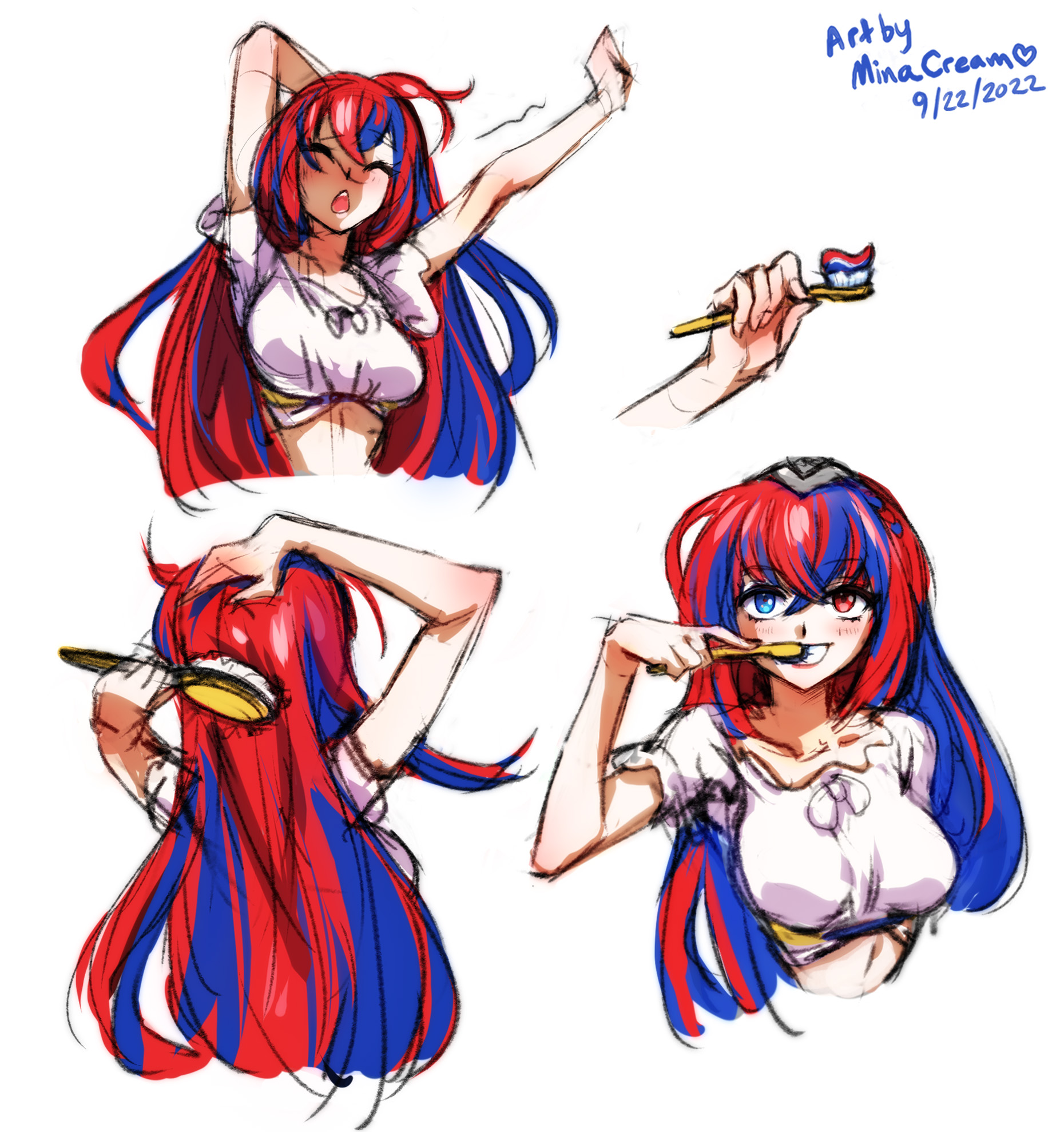 1girl 2022 adapted_costume female_alear_(fire_emblem) artist_name blue_eyes blue_hair blush braid breasts brushing_hair brushing_teeth crossed_bangs crown_braid dated female_focus fire_emblem fire_emblem_engage heterochromia highres long_hair matching_hair/eyes medium_breasts messy_hair mina_cream multicolored_hair navel nintendo open_mouth red_eyes red_hair solo split-color_hair tiara toothbrush toothpaste two-tone_hair unkempt very_long_hair waking_up