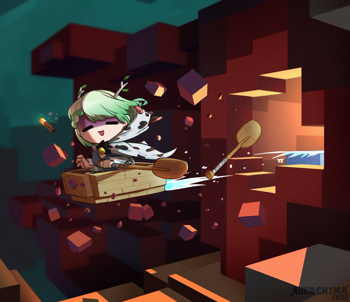 1girl 2022 antlers artist_name aurochima bell boat ceres_fauna chibi closed_eyes cow_hood cowbell facing_viewer green_hair hololive hololive_english horns minecraft neck_bell oar open_mouth rowboat solo virtual_youtuber watercraft