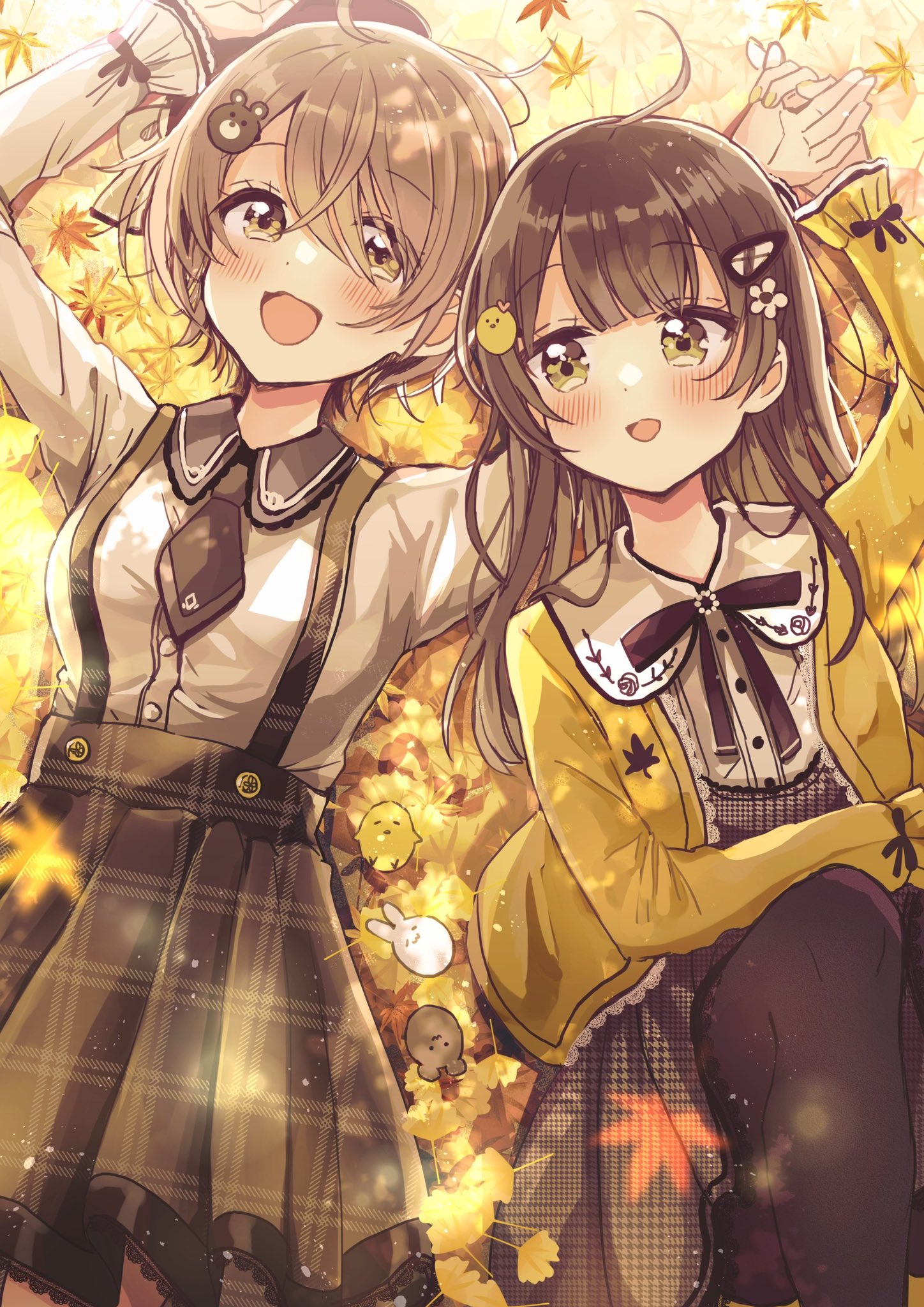 2girls :d ahoge arms_up autumn_leaves bear_hair_ornament black_bow black_pantyhose blush bow breasts brown_dress brown_eyes brown_hair brown_skirt collared_shirt commentary_request dress dress_shirt feet_out_of_frame flower ginkgo_leaf hair_between_eyes hair_flower hair_ornament hairclip highres higuchi_kaede_(swing!!) jacket knee_up leaf long_hair lying maple_leaf multiple_girls okamoto_natsuhi on_back on_ground open_clothes open_jacket open_mouth pantyhose pleated_skirt sakura_oriko shirt skirt small_breasts smile suspender_skirt suspenders swing!! translation_request white_flower white_shirt yellow_jacket
