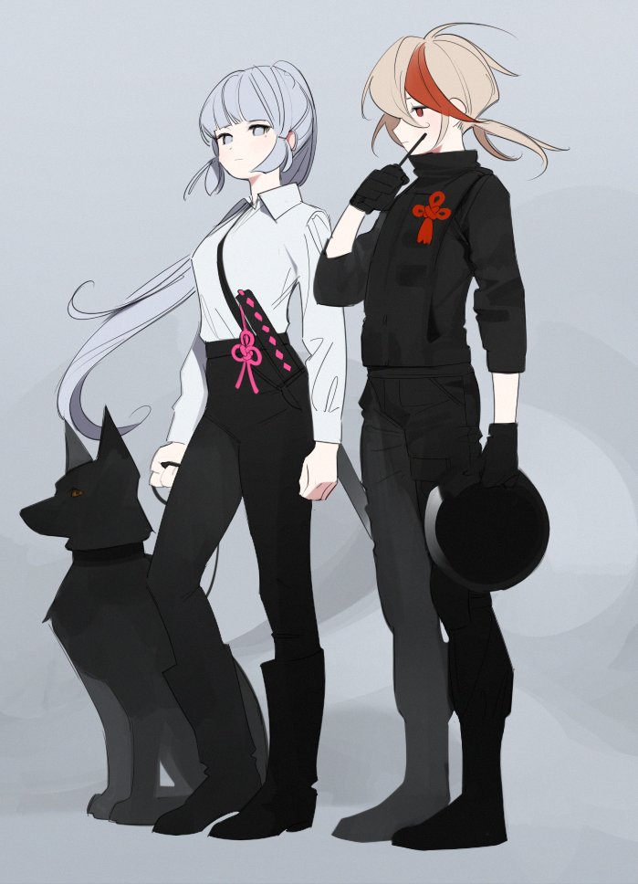 1boy 1girl abbystea ayaka_(genshin_impact) black_footwear black_gloves black_jacket black_pants blue_eyes blue_hair boots chinese_knot commentary contrapposto dog full_body genshin_impact gloves grey_background helmet high_ponytail holding holding_unworn_helmet jacket k9_(dog) kaedehara_kazuha leash long_hair long_sleeves multicolored_hair pants ponytail red_eyes red_hair shirt sidelocks simple_background streaked_hair untranslatable_commentary unworn_helmet very_long_hair walkie-talkie white_hair white_shirt