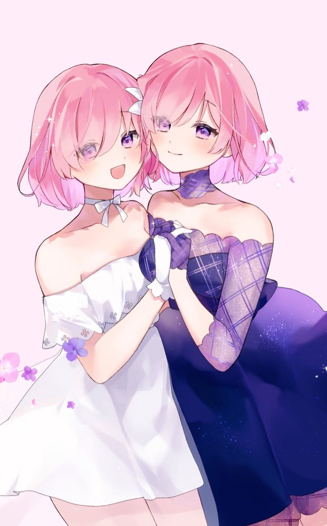 2girls bare_shoulders blush closed_mouth collarbone commentary_request detached_collar dress dual_persona fate/grand_order fate_(series) flower formal_clothes gloves hair_flower hair_ornament holding_hands looking_at_viewer mash_kyrielight mash_kyrielight_(chaldea_dinnertime) mash_kyrielight_(formal_dress) misaki346 multiple_girls off-shoulder_dress off_shoulder official_alternate_costume open_mouth pink_hair purple_dress purple_eyes purple_gloves see-through_clothes see-through_sleeves short_hair sleeveless sleeveless_dress smile white_dress white_flower white_gloves