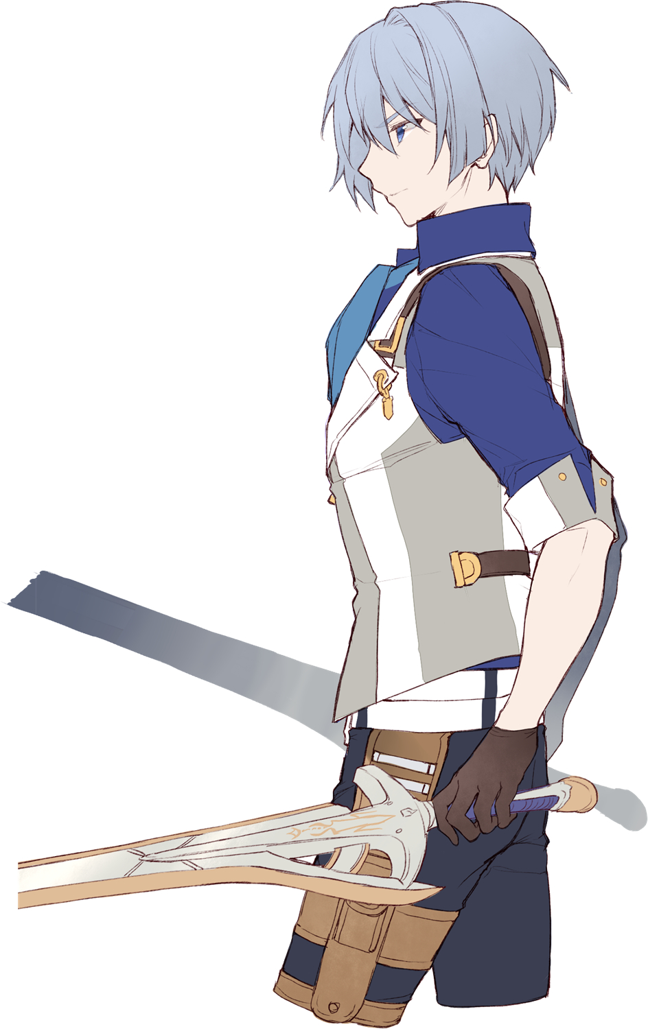 1boy achan_(blue_semi) blue_eyes blue_hair brown_gloves eiyuu_densetsu gloves highres holding holding_sword holding_weapon kurt_vander male_focus sen_no_kiseki sen_no_kiseki_(series) sen_no_kiseki_i sen_no_kiseki_iii sen_no_kiseki_iv short_hair simple_background solo sword weapon white_background