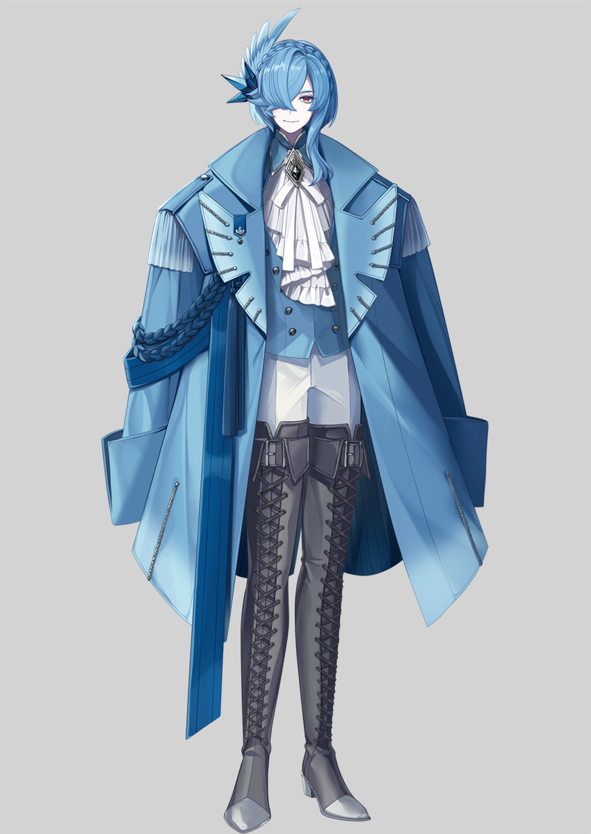 1other androgynous articuno asymmetrical_hair black_gem blue_coat blue_feathers blue_gem blue_hair blue_jacket boots braid brooch buttons closed_mouth coat coat_on_shoulders colored_skin crown_braid feather_hair_ornament feathers fold-over_boots frilled_shirt frills full_body gem gen_1_pokemon grey_background grey_boots hair_ornament hair_over_one_eye highres jacket jewelry legendary_pokemon looking_at_viewer medal medium_hair merlusa neck_ribbon nintendo one_eye_covered open_clothes open_coat other_focus pants personification pokemon red_eyes ribbon shirt sidelocks simple_background solo standing thigh_boots white_pants white_ribbon white_shirt white_skin