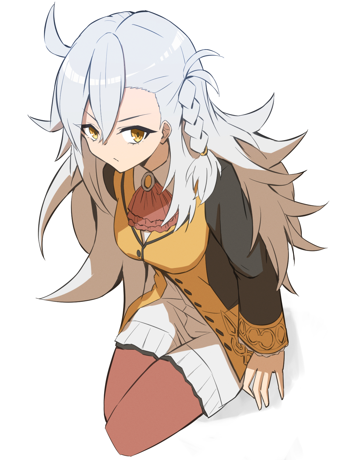 1girl ahoge braid breasts fate/grand_order fate_(series) grey_hair hamao_1 highres long_hair looking_at_viewer medium_breasts olga_marie_animusphere pantyhose red_pantyhose side_braid solo yellow_eyes