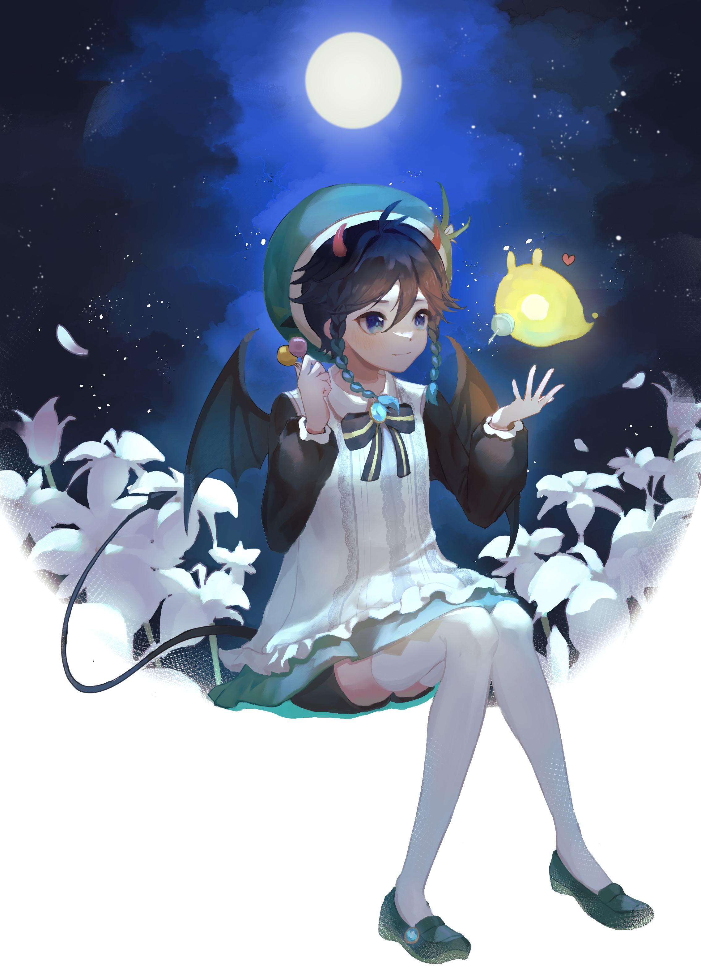 1boy absurdres androgynous bat_wings bbtskazedaaaaa beret black_hair black_shorts black_wings blue_eyes blue_hair braid candy demon_horns demon_tail flower food genshin_impact gradient_hair green_hat green_shoes hat highres holding holding_candy holding_food holding_lollipop horns loafers lollipop long_sleeves male_focus multicolored_hair official_alternate_costume red_horns seelie_(genshin_impact) shoes short_hair_with_long_locks shorts side_braids sitting solo tail thighhighs twin_braids venti_(genshin_impact) venti_(halloween)_(genshin_impact) white_flower white_thighhighs wings