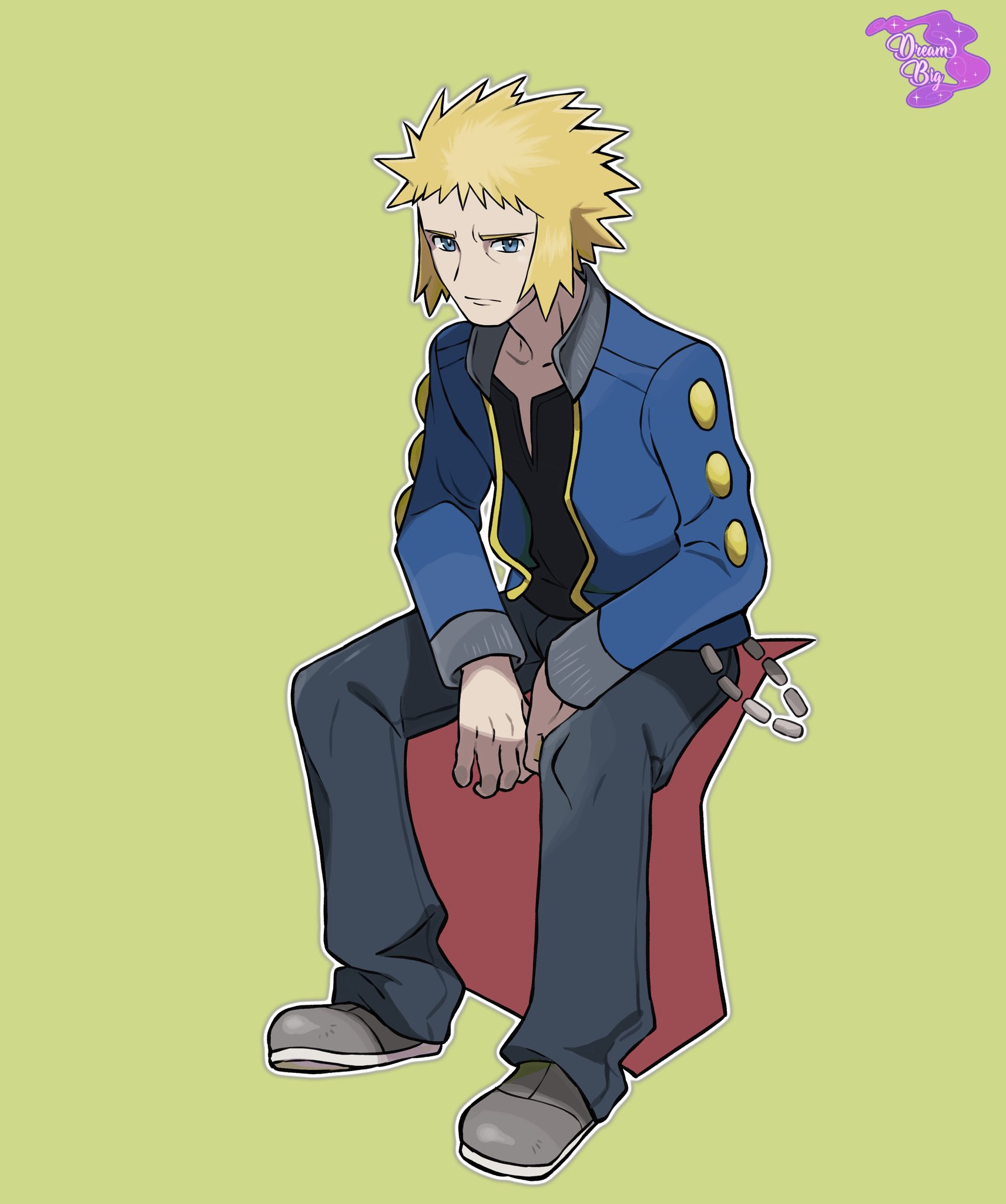 1boy arm_support black_shirt blonde_hair blue_eyes collarbone dreambig full_body green_background grey_footwear highres looking_at_viewer male_focus nintendo pokemon pokemon_diamond/pearl/platinum sad shirt signature sitting solo volkner_(pokemon)