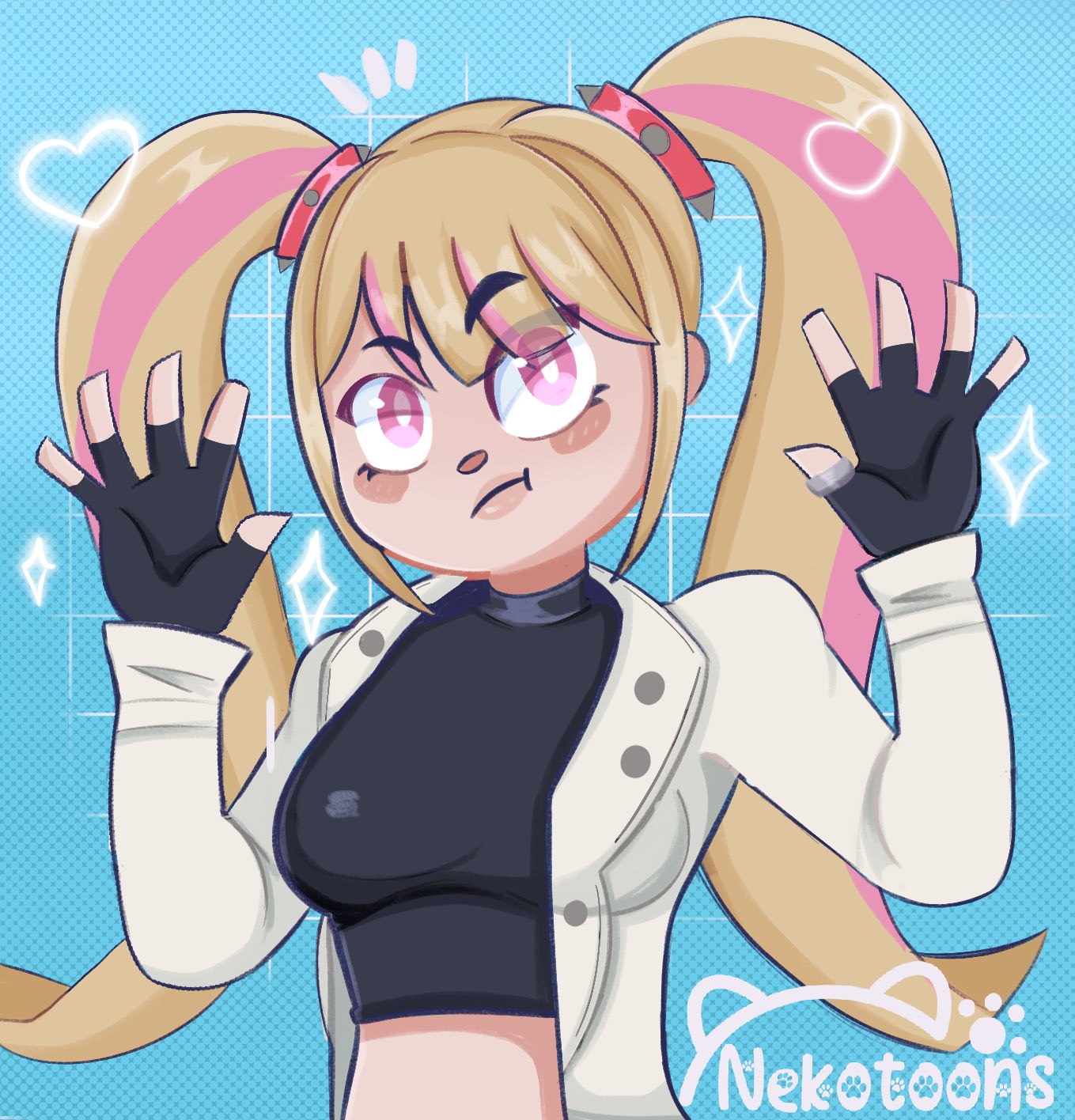 black_shirt breasts crop_top fortnite highres jacket lennox_rose long_hair multicolored_hair nekotoonuwu ponytail shirt white_jacket