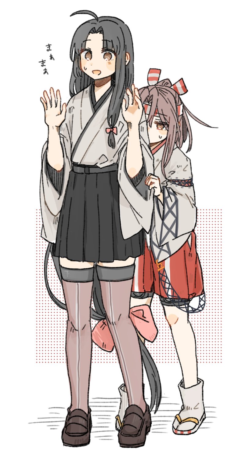 2girls ahoge black_hair black_hakama black_skirt brown_eyes grey_hair hachimaki hakama hakama_short_skirt hakama_shorts hakama_skirt headband hiding high_ponytail highres hinata_hibari japanese_clothes kantai_collection long_hair low-tied_long_hair multiple_girls ponytail red_shorts shorts shouhou_(kancolle) skirt zuihou_(kancolle)