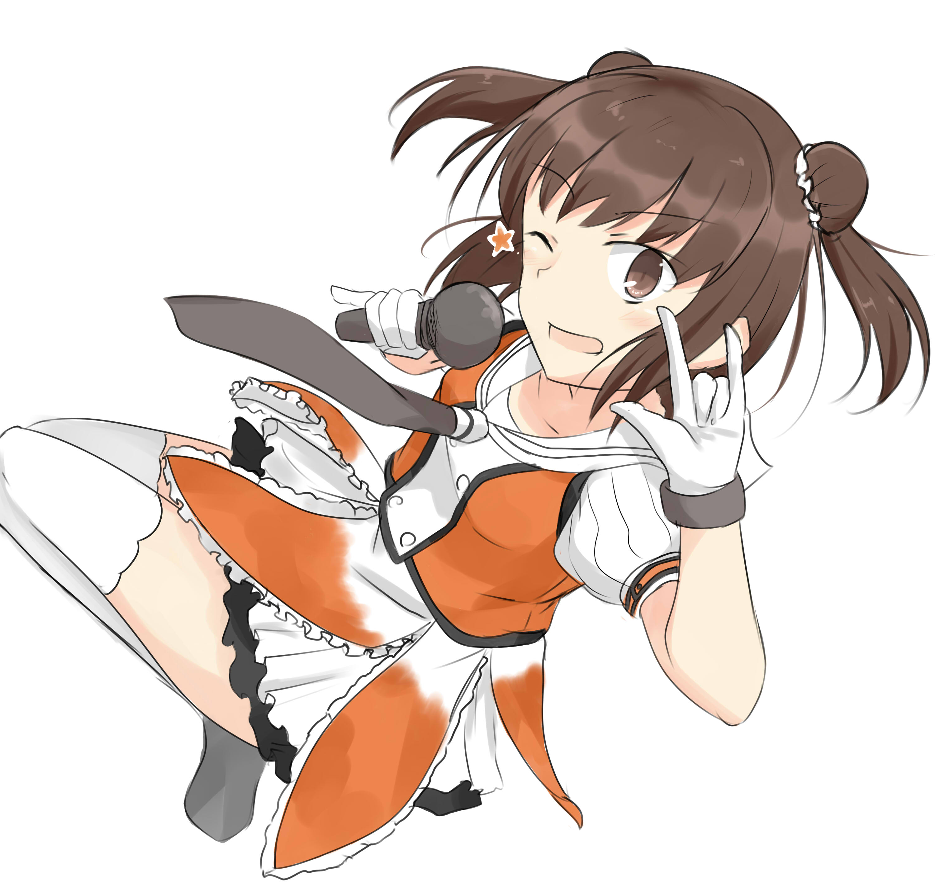 1girl absurdres antenna_hair black_neckerchief brown_eyes brown_hair buttons commentary_request double-breasted double_bun gloves hair_bun highres izumi_subaru kantai_collection m/ microphone naka_(kancolle) neckerchief one_eye_closed pleated_skirt sailor_collar school_uniform serafuku skirt solo thighhighs white_gloves white_sailor_collar white_skirt