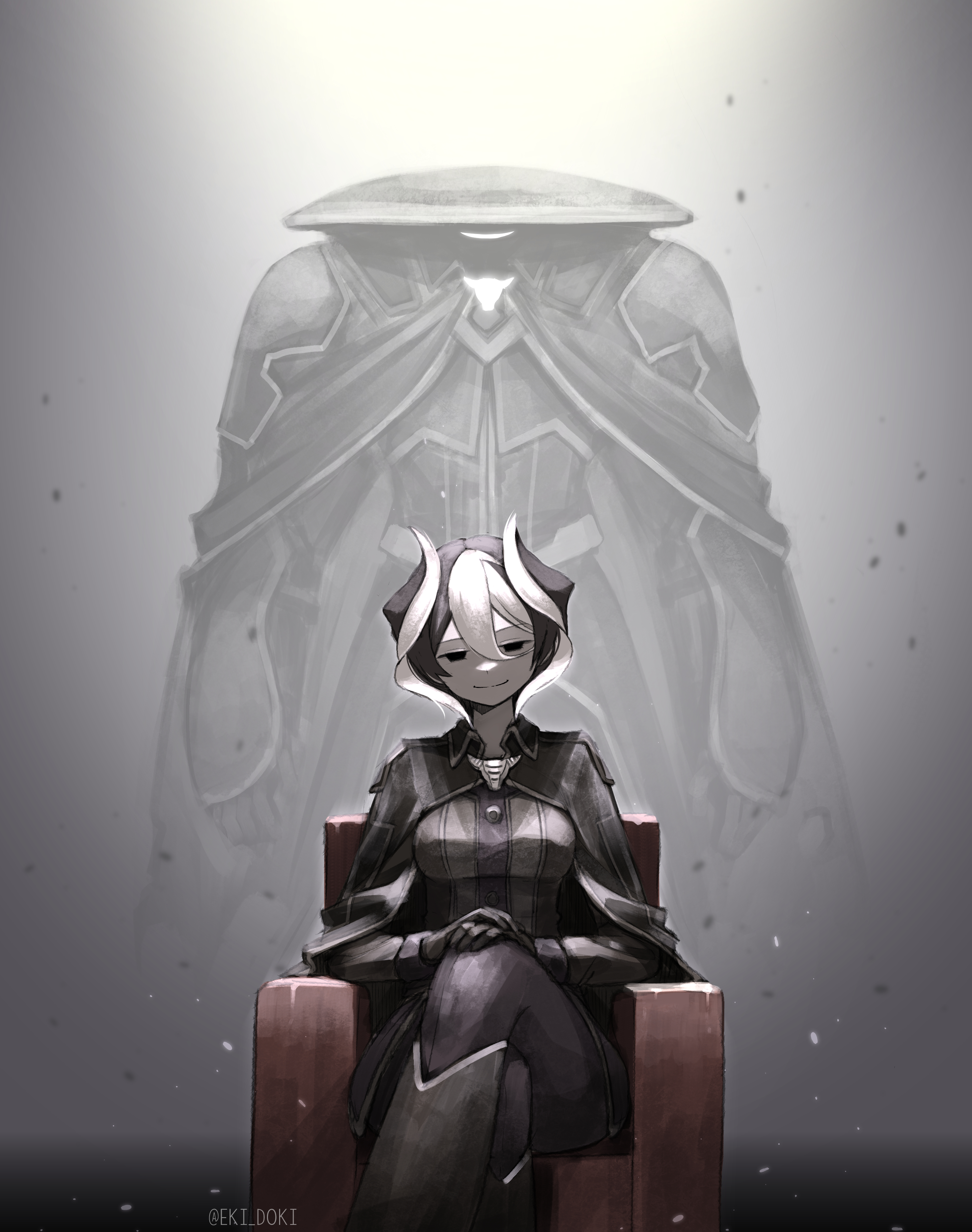 1girl absurdres armor black_armor black_cape black_eyes cape chair closed_mouth crossed_legs eki_doki gradient_background grey_background hat highres looking_at_viewer made_in_abyss multicolored_hair ozen short_hair sitting smile solo two-tone_hair whistle whistle_around_neck white_hair