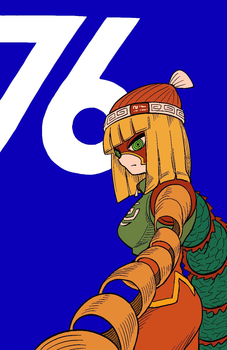 1girl arms_(game) beanie blonde_hair blue_background bob_cut domino_mask eye_mask from_side green_eyes hachinos_ssb hat highres mask min_min_(arms) short_hair solo
