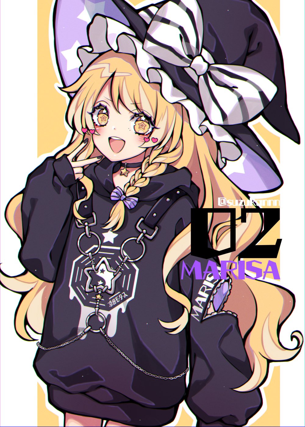 1girl alternate_costume black_choker black_hat black_hoodie black_nails blonde_hair blush border bow braid chain character_name choker fingernails frills gold hair_between_eyes hair_bow hat hat_bow heart highres hood hoodie jewelry kirisame_marisa kyouda_suzuka long_fingernails long_hair long_sleeves looking_at_viewer mini-hakkero nail_polish numbered open_mouth outside_border puffy_long_sleeves puffy_sleeves purple_bow silver_chain simple_background single_braid smile solo star-shaped_pupils star_(symbol) star_print striped_bow symbol-shaped_pupils teeth tongue touhou twitter_username v v-shaped_eyebrows white_border white_bow witch_hat yellow_background yellow_eyes