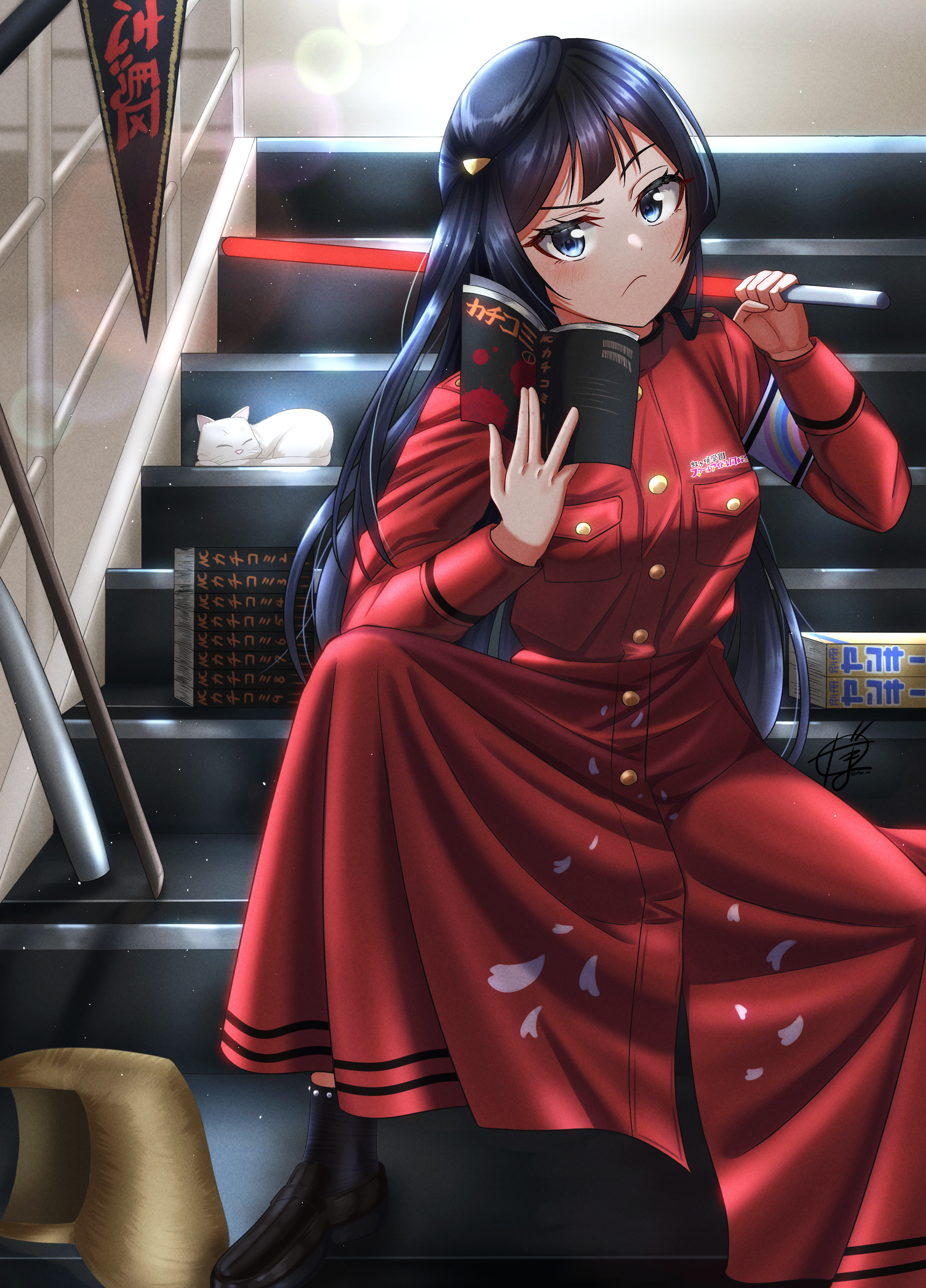 1girl absurdres armband black_hair bokken bright09 cat coat commentary grey_eyes hair_ornament highres long_hair love_live! love_live!_nijigasaki_high_school_idol_club manga_(object) one_side_up pompadour reading sheath sidelocks signature sitting solo stairs sword trench_coat weapon wig wooden_sword yuki_setsuna_(love_live!)