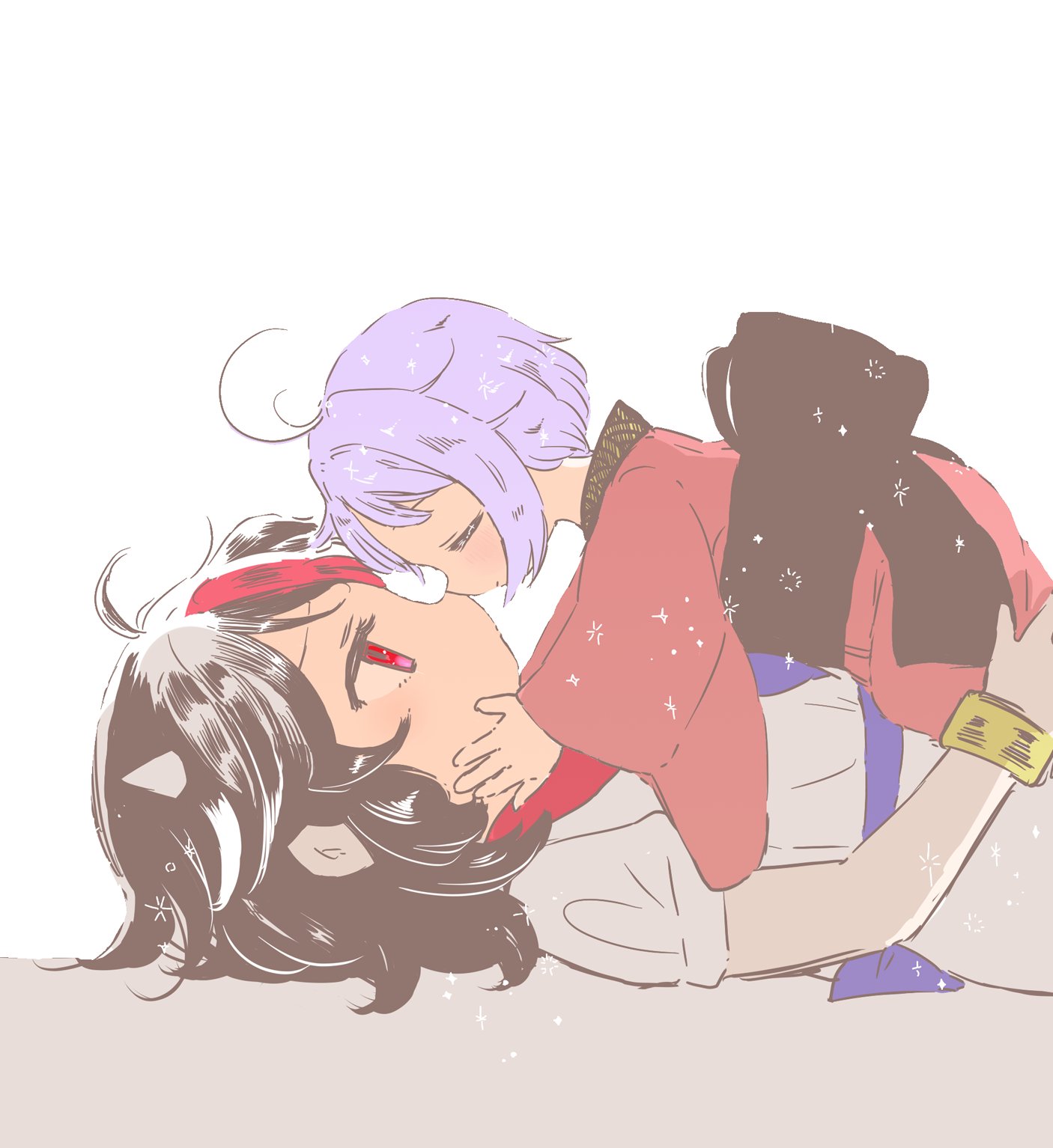 2girls ahoge black_hair closed_eyes cone_horns dress grey_horns highres horns japanese_clothes kijin_seija kimono looking_at_another lying mini_person minigirl multiple_girls on_back on_person purple_hair red_eyes red_hair red_kimono rin_tarou short_hair simple_background small_horns sukuna_shinmyoumaru touhou white_background white_dress yuri