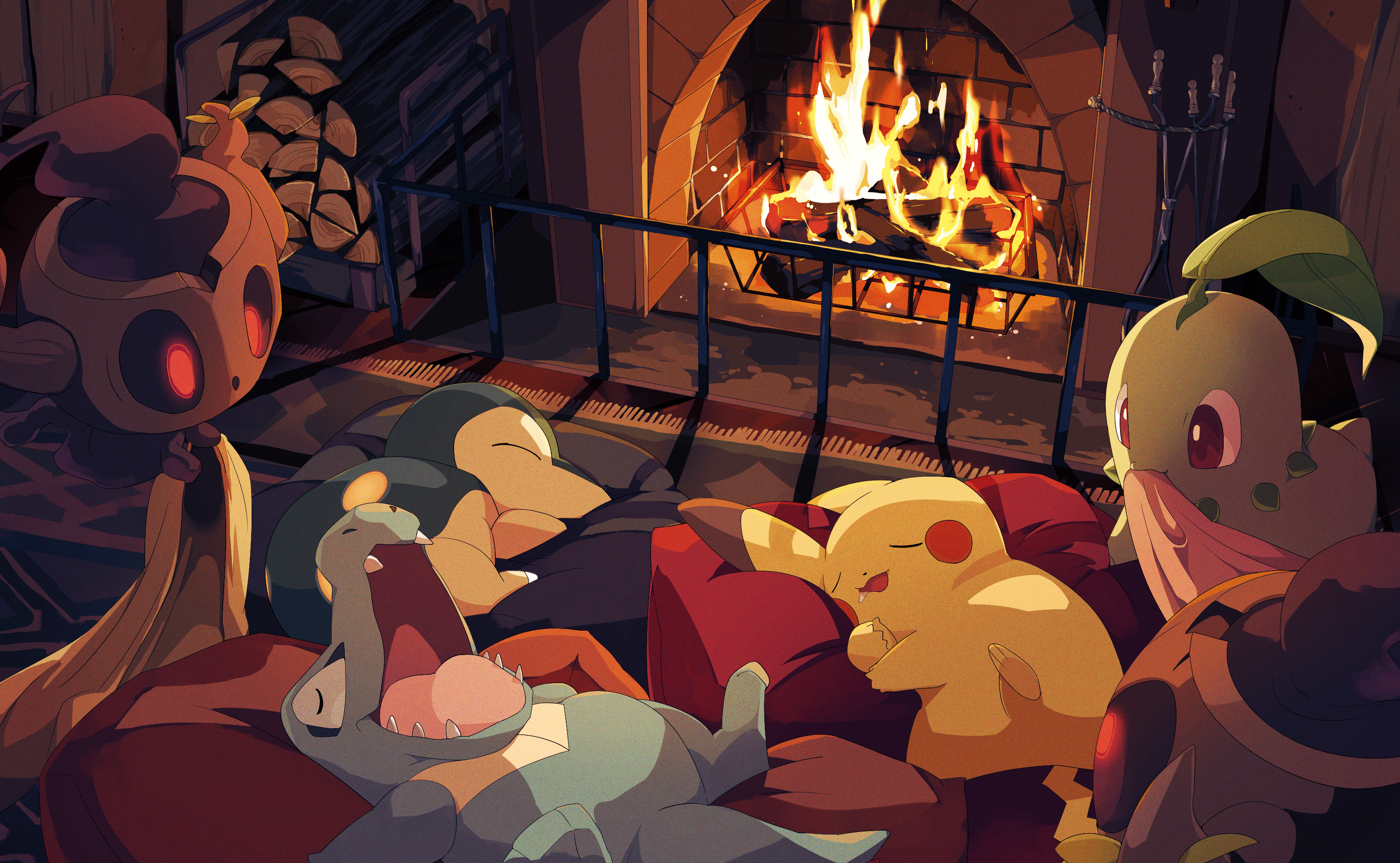 absurdres chikorita commentary_request cushion cyndaquil fireplace floating gen_1_pokemon gen_2_pokemon gen_6_pokemon highres holding indoors kura_(shironagasu02) log lying nintendo no_humans on_back open_mouth phantump pikachu pokemon pokemon_(creature) sleeping starter_pokemon_trio totodile