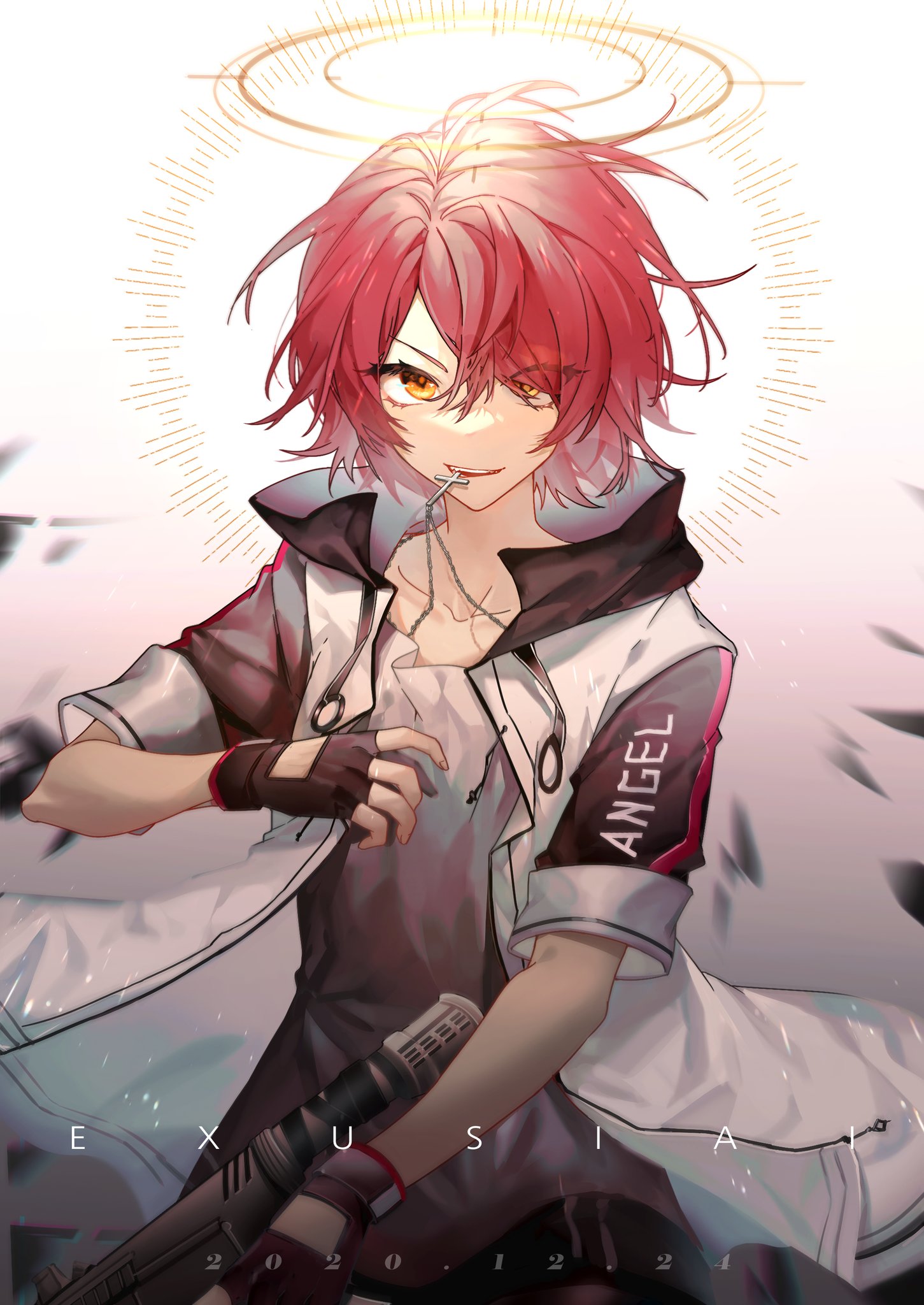 1girl arknights black_gloves character_name clothes_writing dated exusiai_(arknights) fingerless_gloves gloves grey_shirt gun halo hand_up highres holding holding_gun holding_weapon hood hooded_jacket jacket looking_at_viewer mouth_hold open_clothes open_jacket open_mouth red_hair shirt short_hair smirk solo teeth_hold tobunchudoku upper_body weapon white_jacket yellow_eyes