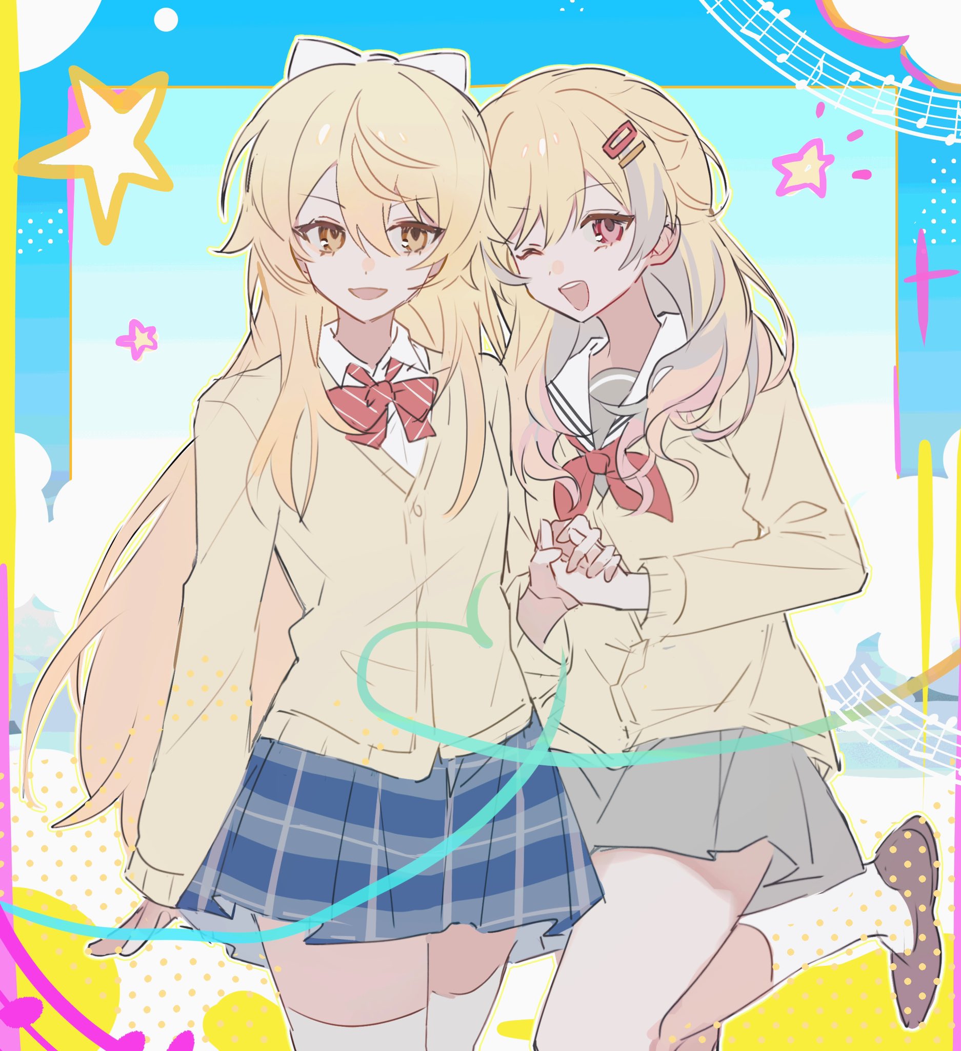 2girls ;d blue_skirt bow bowtie brown_footwear cardigan colored_tips commentary diagonal-striped_bow diagonal-striped_bowtie diagonal-striped_clothes genderswap genderswap_(mtf) grey_serafuku grey_skirt hair_bow hair_ornament hairclip highres hisakawa_sora kamiyama_high_school_uniform_(project_sekai) leg_up long_hair long_sleeves miyamasuzaka_girls'_academy_school_uniform multicolored_hair multiple_girls neckerchief one_eye_closed open_mouth pink_hair plaid_clothes plaid_skirt pleated_skirt project_sekai red_neckerchief sailor_collar school_uniform serafuku shirt shoes siblings sisters skirt smile socks standing standing_on_one_leg striped_bow striped_bowtie striped_clothes tenma_saki tenma_tsukasa thighhighs white_bow white_sailor_collar white_shirt white_socks white_thighhighs yellow_cardigan