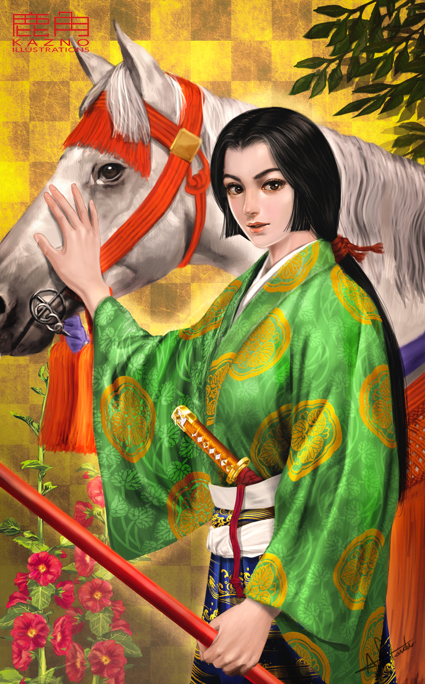 1girl black_hair brown_eyes checkered_background crest family_crest flower green_kimono hair_tie hand_on_another's_head highres holding hollyhock horse japanese_clothes kimono komatsuhime low_ponytail mitsuba_aoi_(tokugawa_mon) obi original ponytail real_life sash sengoku_gallery simple_background sword tsuka-ito weapon