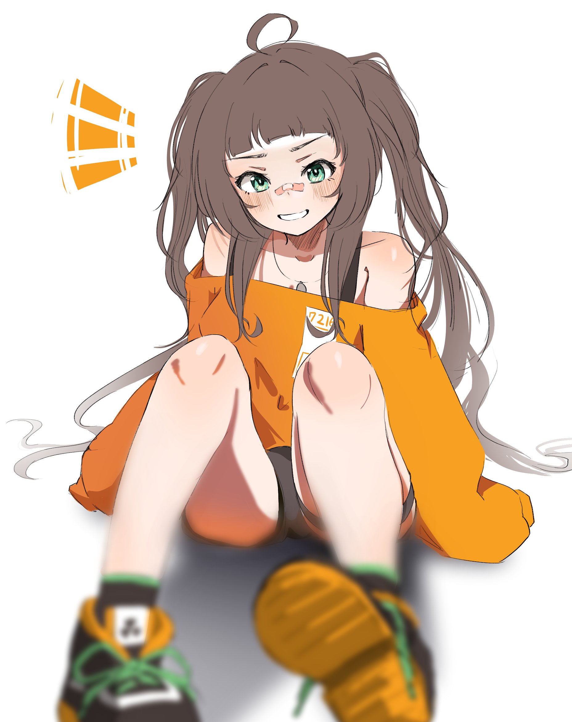 1girl bandaid bandaid_on_face bandaid_on_nose bare_shoulders brown_hair buibui green_eyes highres hololive jacket natsuiro_matsuri orange_jacket sitting solo twintails virtual_youtuber