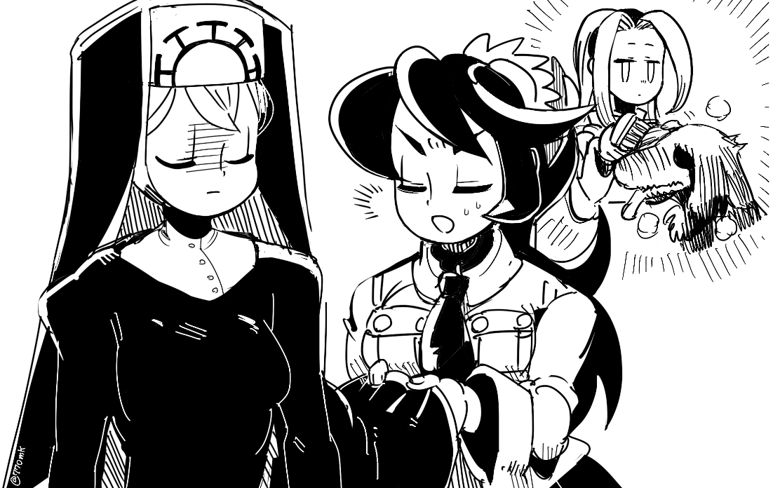 2girls 770mk closed_eyes dog_(skullgirls) double_(skullgirls) filia_(skullgirls) greyscale habit hair_brush hairband monochrome multiple_girls necktie nun open_mouth skullgirls speech_bubble sweatdrop thought_bubble