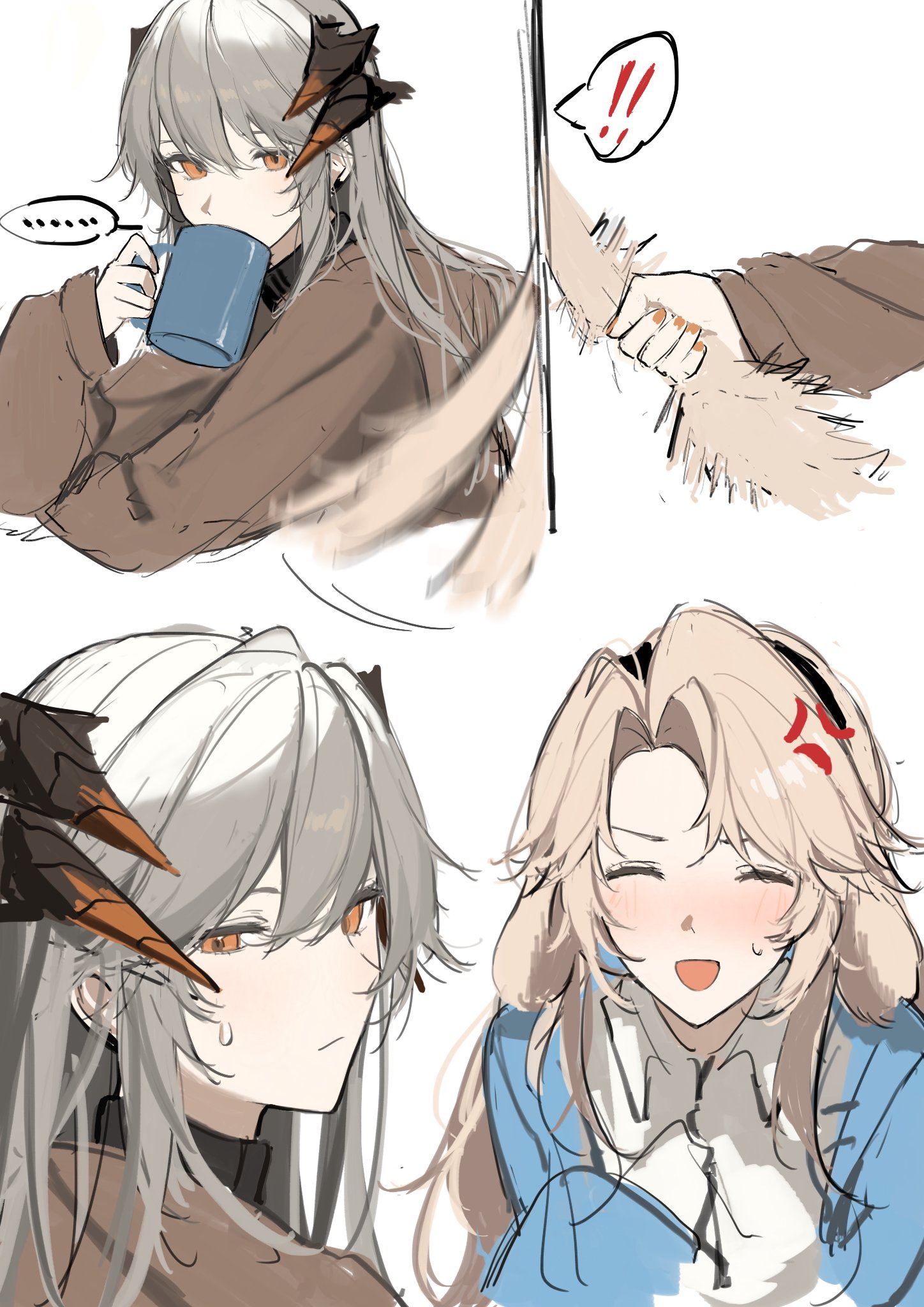 ! ... 2girls afterimage anger_vein animal_ears arknights black_hairband blonde_hair blue_jacket blush brown_sweater closed_eyes collared_shirt cup dog_ears dog_girl dog_tail dragon_girl dragon_horns drinking earclip hairband highres holding holding_cup horns jacket joshua_(shisanli934) kristen_(arknights) long_sleeves mug multiple_girls nail_polish open_clothes open_jacket open_mouth orange_eyes orange_nails saria_(arknights) shirt spoken_ellipsis spoken_exclamation_mark sweatdrop sweater tail tail_grab tail_wagging white_shirt