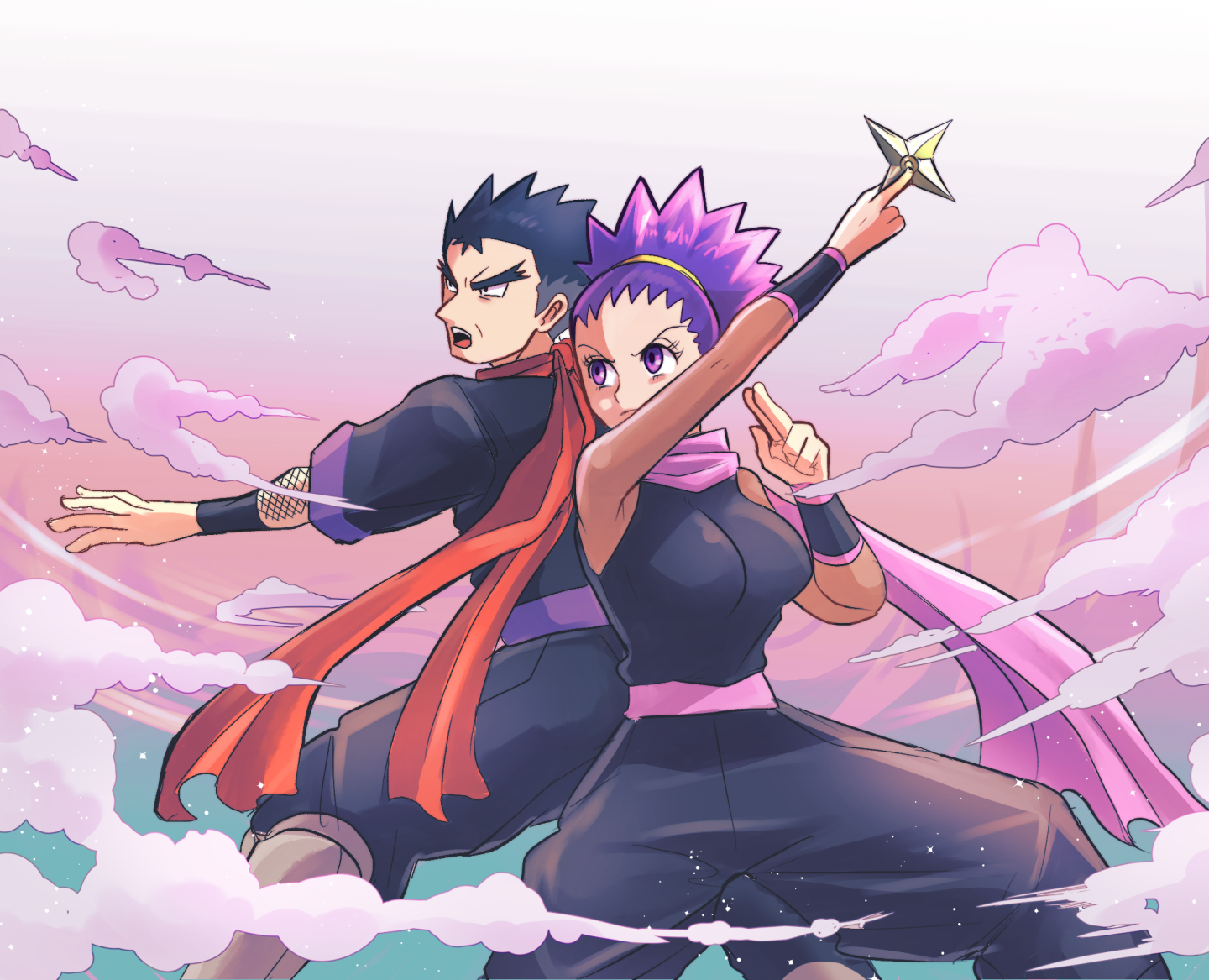 1boy 1girl arm_up black_eyes black_hair black_pants breasts closed_mouth commentary_request eyelashes father_and_child father_and_daughter fishnets holding holding_shuriken holding_weapon janine_(pokemon) koga_(pokemon) makita_(mugitya3776) nintendo open_mouth pants parent_and_child pokemon pokemon_heartgold_and_soulsilver purple_eyes purple_hair purple_scarf scarf short_hair shuriken smoke spiked_hair teeth tongue upper_teeth_only weapon wristband